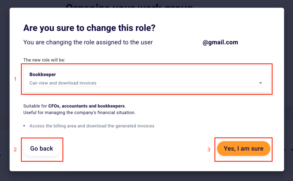 In case you choose to change the Workspace user role, this screen will appear. Click the select under the wording “The new role will be:” (1) and select the new function of your collaborator. Click “Go Back” (2) to go back to the previous settings or “Yes, I’m sure” (3) to confirm the change.