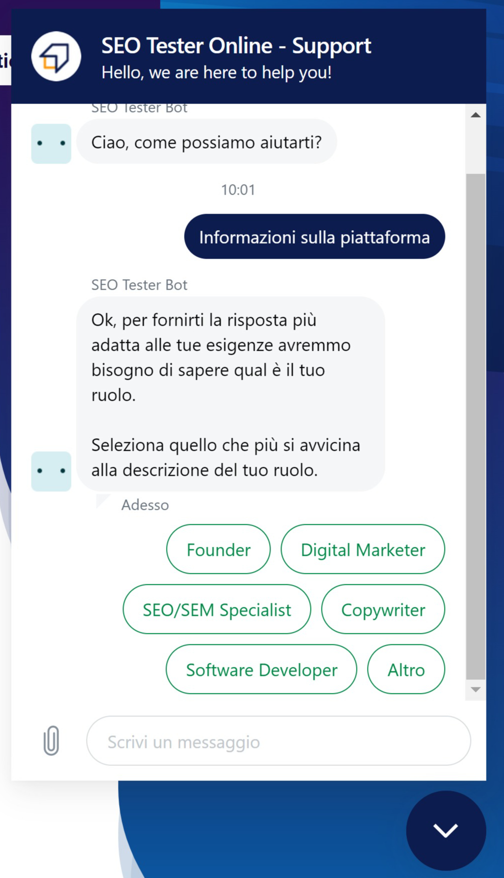 By selecting the other options, such as “Book a free demo”, “Information on plans and prices” or by typing a custom text in the “Write a text” box, you will always get precise feedback and all the useful information to answer your questions or simple doubts.