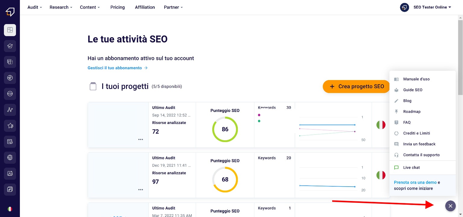 The second Floating Button, on the other hand, is located on our SEO suite and offers users a series of shortcuts to useful resources to make the most of the tools, check the status of credits and limits, or to contact technical support. But let’s see the various items together, point by point, in the following paragraph.