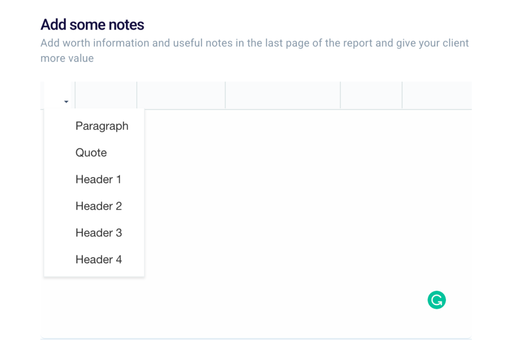 Finally, you can edit your report by setting paragraphs or headers in the last section “Add some notes“.