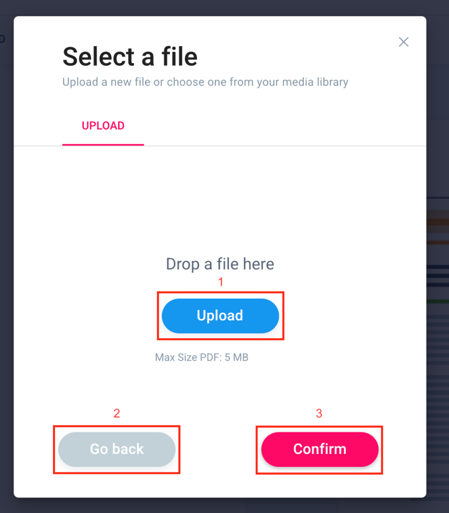 If you want to upload your logo drag and drop your image file or insert it by clicking “Upload” (1). Go back by clicking “Go back” (2) and click “Confirm” (3) to continue customizing the report. Remember that the image must not exceed 5 MB in size.