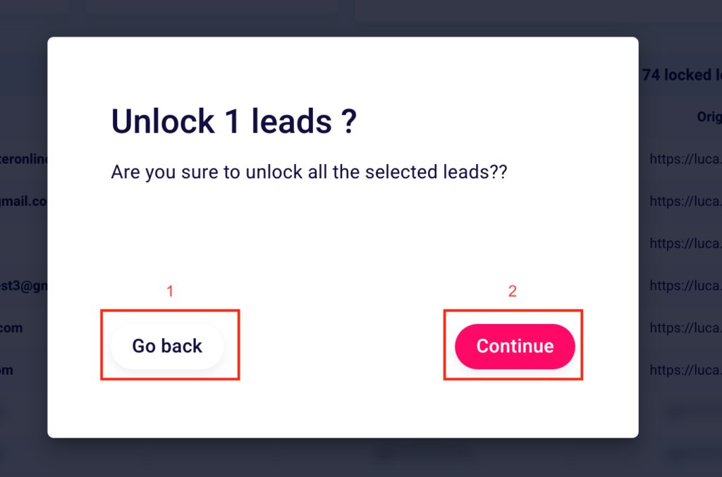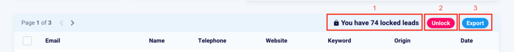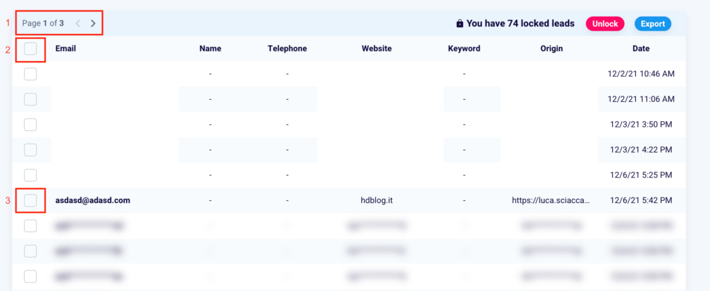 Once you have selected one or more emails, you can decide to unblock them by clicking the pink “Unblock” button (2). You can also export the leads and their information by clicking “Export” (3).