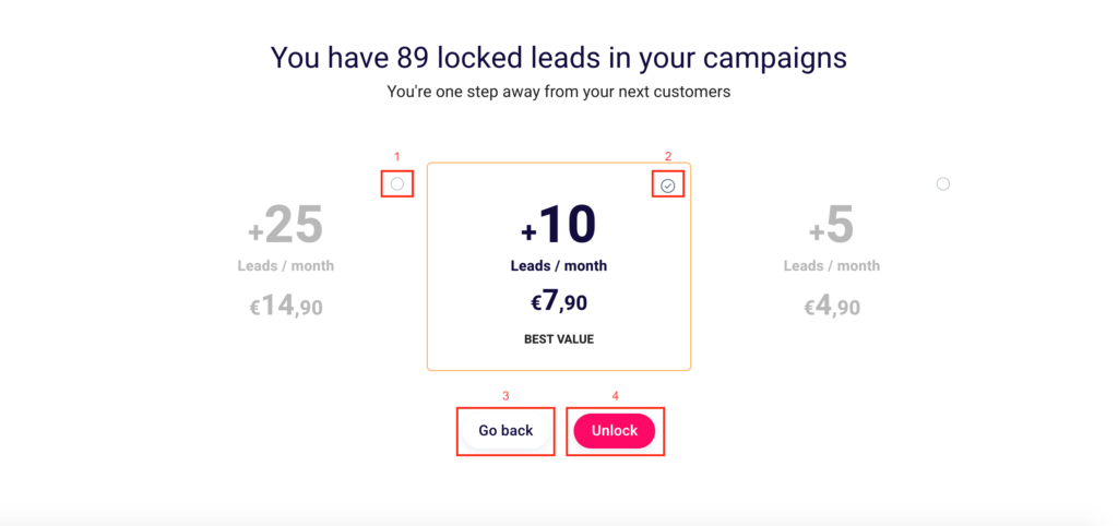 Choose the number of new contacts you want to unlock each month. Select the “+25 contacts/month” solution (1) or “+10 contacts/month“(2) and finalize your operation by clicking “Unblock” (4). To return to the previous screen click “Back” (3).