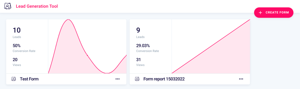 You can generate a new form whenever you want by returning to the main screen of the Lead Generation Tool, clicking the respective icon in the side menu on the left or from here, and selecting the button at the top right “+ Create Form“. Form that we remind you, you can later insert on your site by pasting an embed.