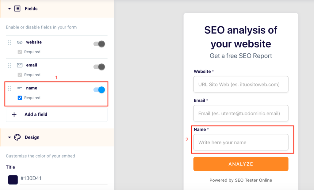 In the left part of the screen (1) you can decide the changes to be made to your form, while in the right part (2), instead, you can see them applied, in real-time.