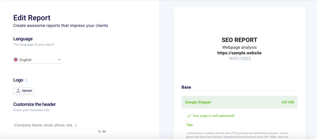 By default, the report that your users will download after filling out the survey will contain the SEO score of the page or site, a brief exam description, and a simple solution to the problem.