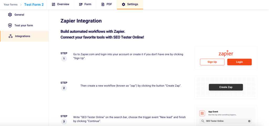 By clicking “Test your form” on the same screen, you’ll land on this page in the menu on the left.
