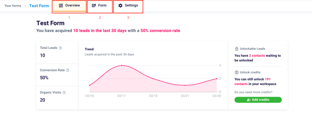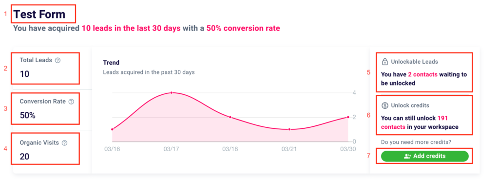 In the top left corner, you will find the name of the form (1). In the first box, you can see the number of contacts collected (2), the conversion rate of the form (3), i.e. the percentage ratio between organic visits (or views of the form) (4), and the number of leads obtained.