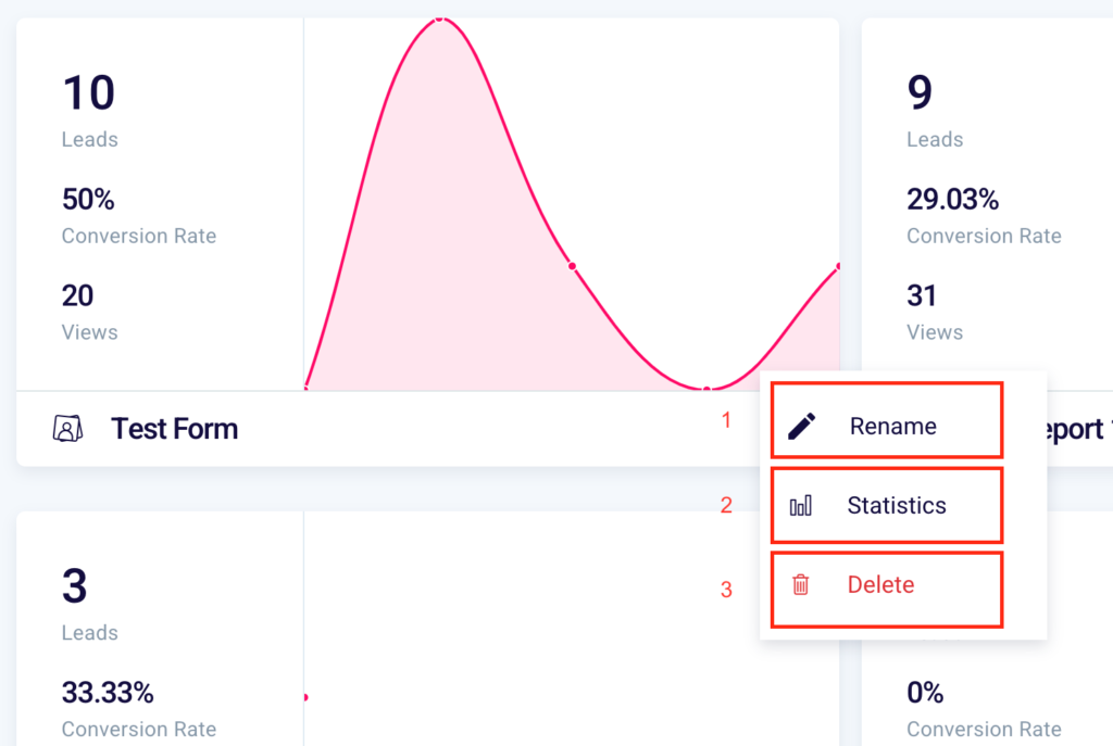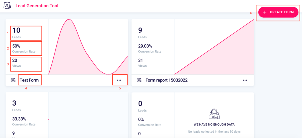 You’ll be able to see the number of contacts collected (1), the conversion rate of the form (2), that is the percentage ratio between the views of the form (3), and the number of leads obtained.