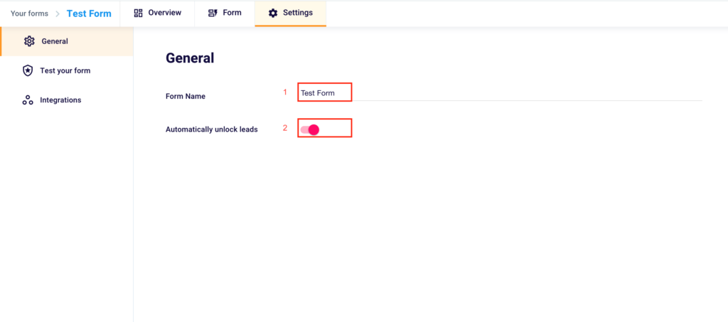 Here you’ll be able to rename the form, typing the new name in the box to the right of “Form Name” (1) and choose to “Automatically unlock leads” (2) once collected, so you don’t have to manually unlock the collected contacts, as shown above.