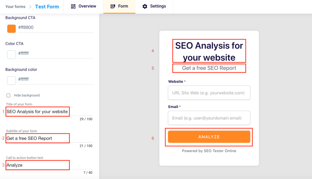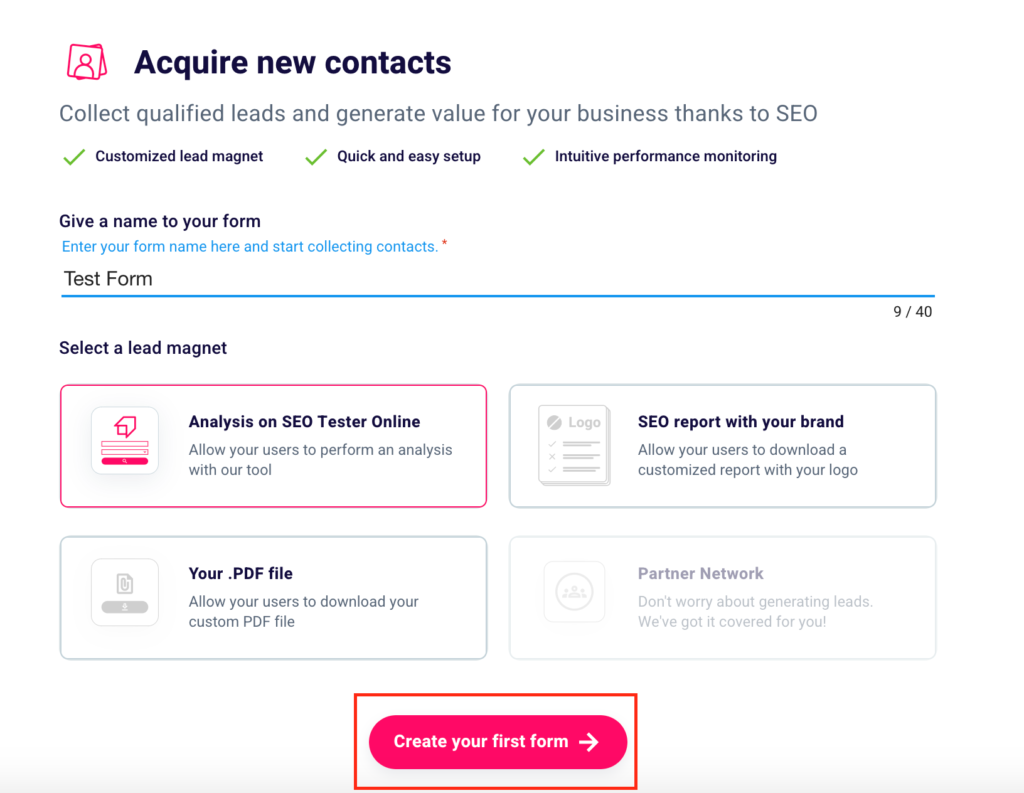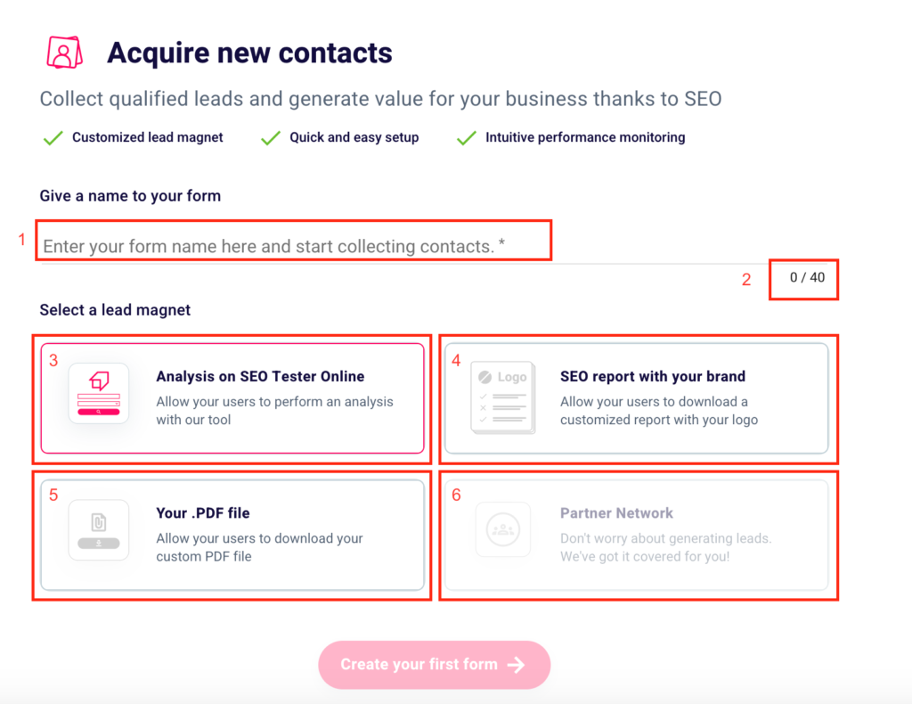 Then you can choose one of the available lead magnets. You can give the possibility to the users who fill in your form to analyze their website or that of a competitor with our SEO Checker. If you prefer this option and want your users to be redirected to our platform click “Analysis on SEO Tester Online” (3).