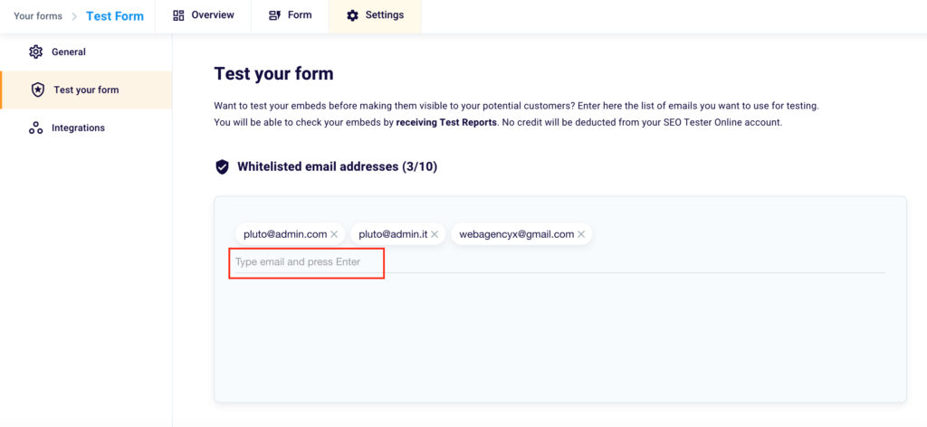By inserting email addresses in Whitelist you will have the possibility, once you’ve accessed the page where you’ve applied the embed code, to test the form without being deprived of credits.