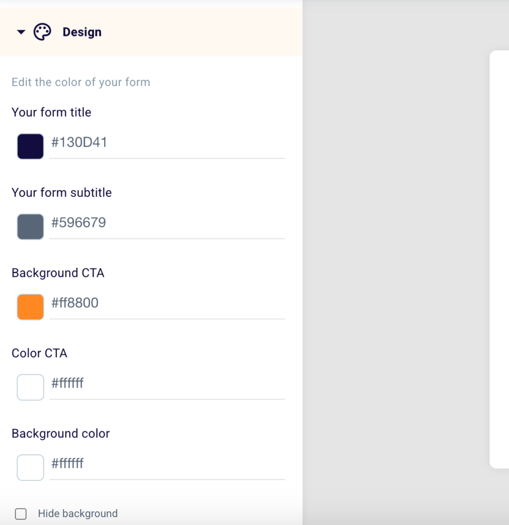 Scroll down to the design section, where you can change the layout of your form. We suggest, for the choice of colors, customize the form making it as much in line as possible with the design and brand image of your website.