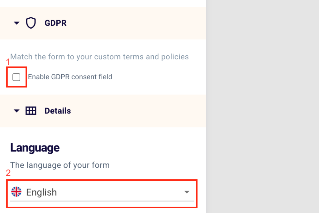 Do not forget to enable GDPR consent field (1), the General Data Protection Regulation, and remember to set the language of the form (2) by selecting Italian, English, Spanish and Polish.