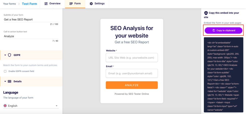 The form will have the structure of the one presented on the right of this screen and will allow users of your site or users who visit the landing page on which you will install your embed, after entering their site name, their email, a keyword and/or other required data, to get an SEO analysis via SEO Tester Online, a white label SEO report or a file prepared by you.