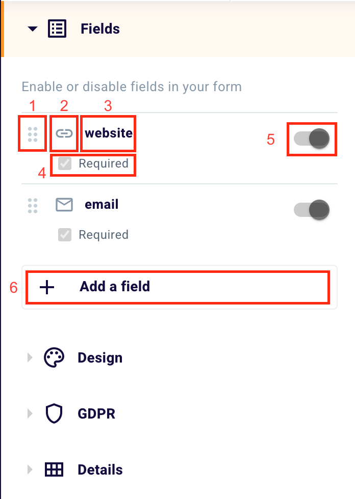 First of all, you can decide which fields to have your user fill in. With the drag and drop function (1) you can choose the order of the fields by dragging them. From the left to the right the type of field, indicated by an icon (2), the name of the field (3), in this case, “website”, the box “Required” (4) to check when you want to declare a field as mandatory and the toggle (5) to choose whether to insert a field or not.