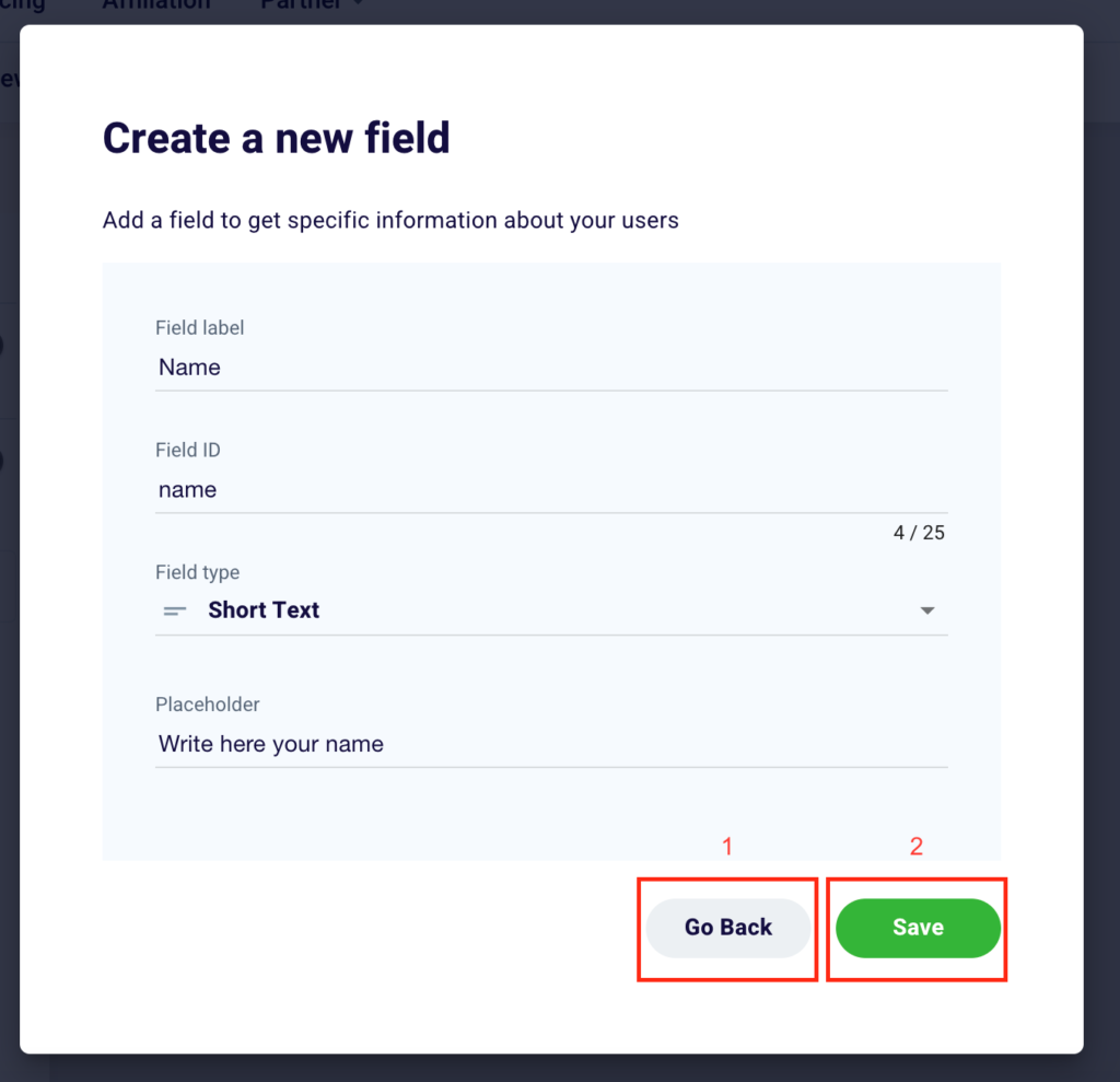 Click “Go Back” (1) to go back or “Save” (2) to permanently add a new field or confirm changes made to a pre-existing box.