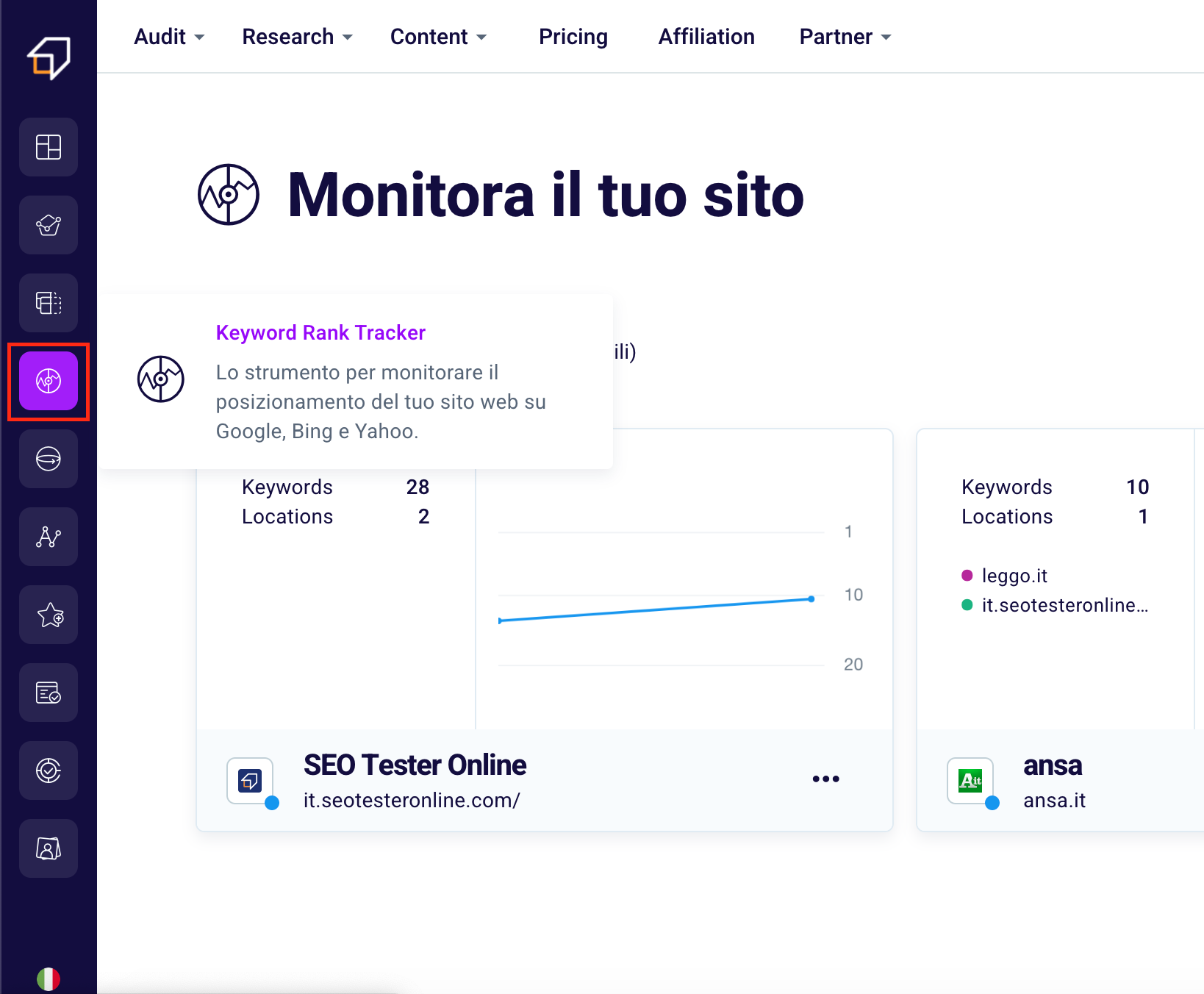To access our Keyword Rank Tracker, simply click on the respective icon in the side menu on the left or access by clicking here.