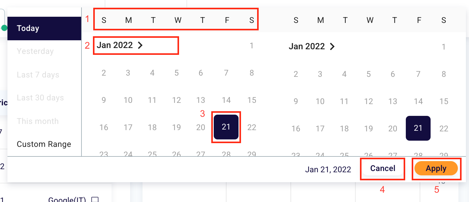 You will see a calendar appear in which to choose between different days of the week (1) and different months (2), the start date of the tracking (3) and its end time. To return to the default settings click “Cancel” (4), or if you want to confirm the selected period, click the orange “Apply” button (5).