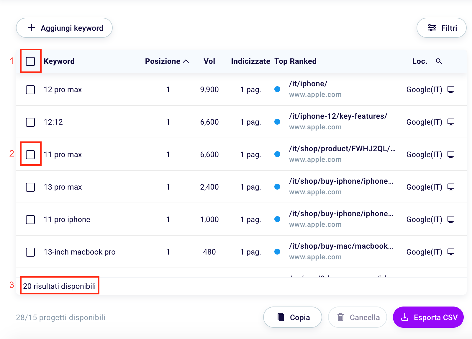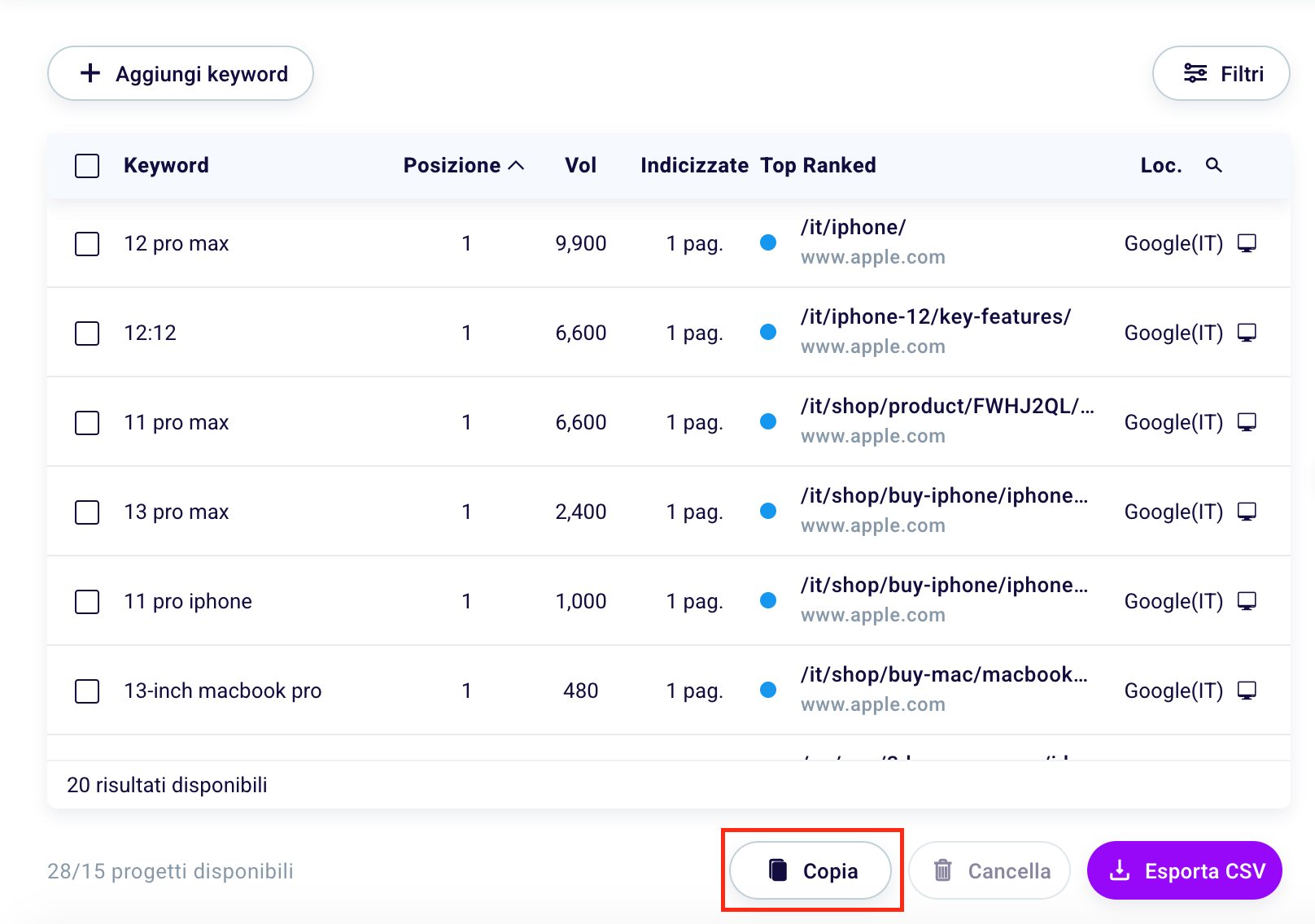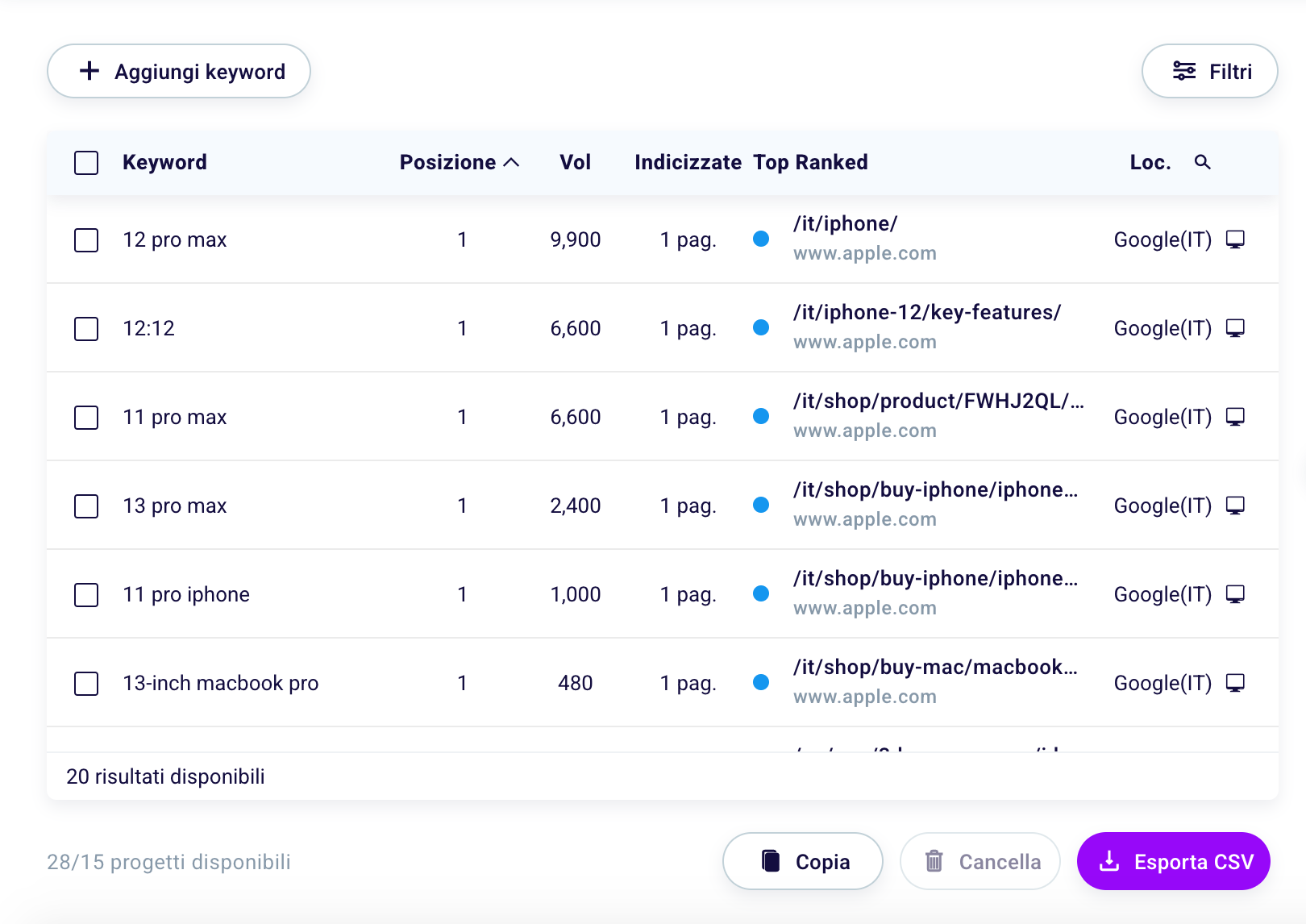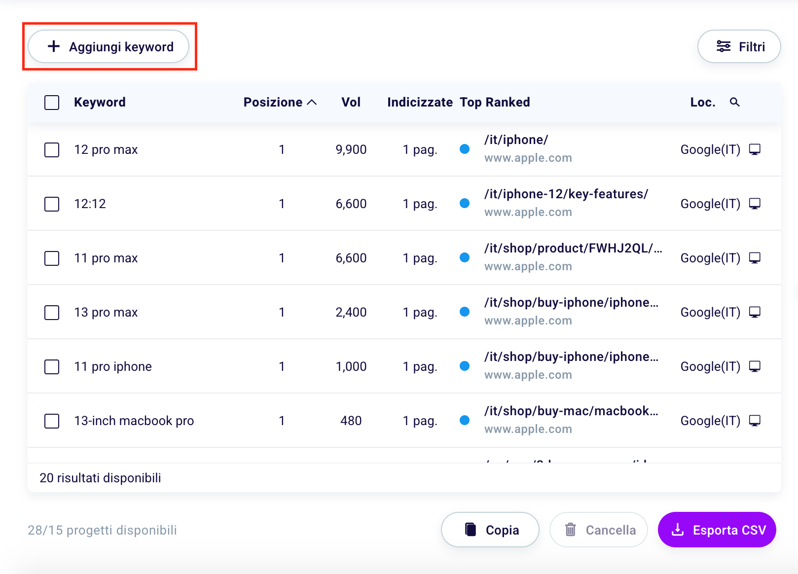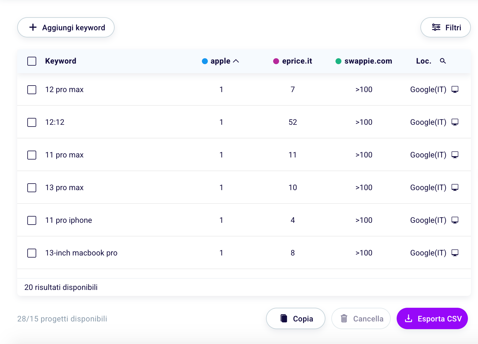 If you are monitoring many keywords within a project, it may be useful to filter them, in order to view those of interest to you at a given moment.