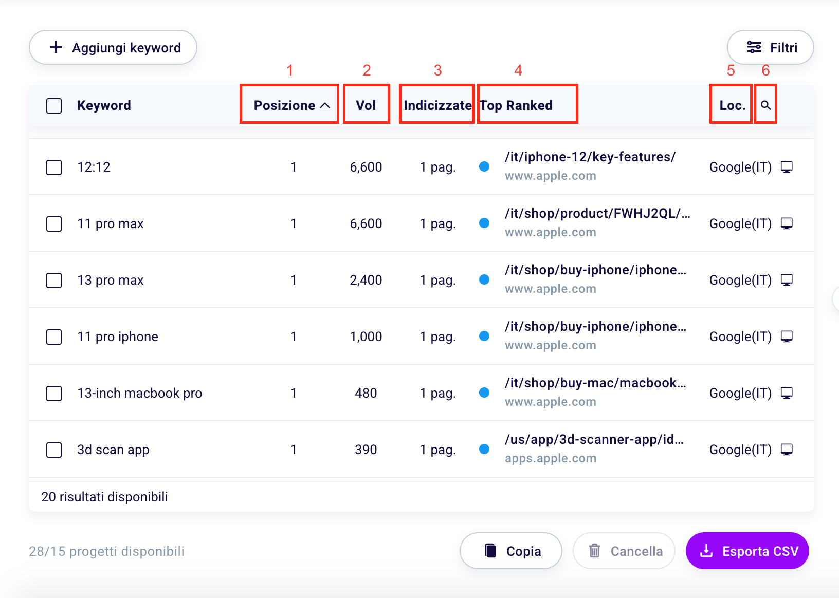 “Loc.” (5) instead stands for Location, and indicates the configuration, given by the set of search engine, country and device of the keyword taken into consideration.
