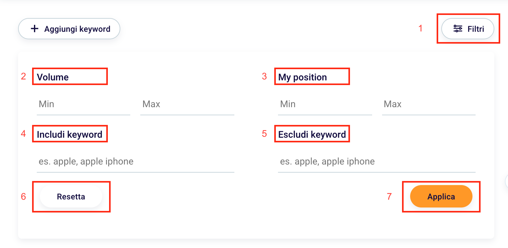 To do this, simply click on “Filters” (1) at the top right and set “Volume” (2) minimum and maximum, “My Position” (3), that is the minimum or maximum position of a specific page for a specific word key. You can filter results that contain certain words with “Include keywords” (4) or that don’t contain those words with “Exclude keywords” (5).
