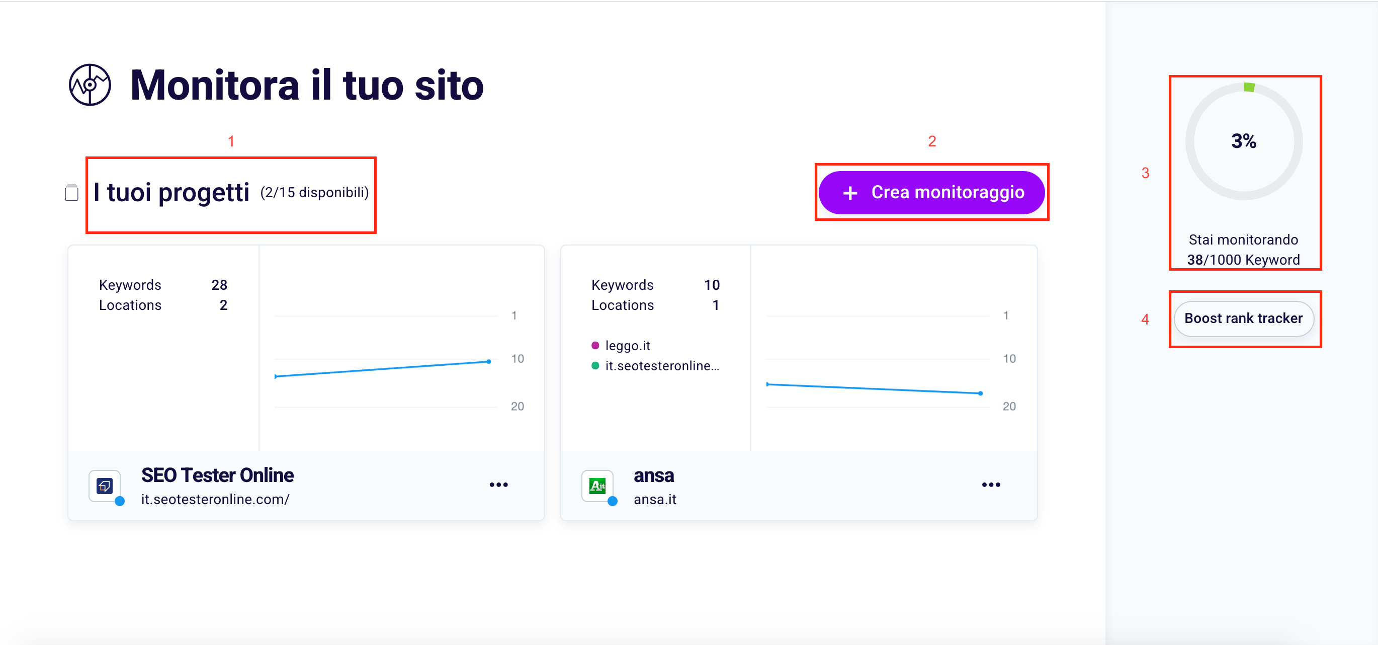 If you want to monitor a new site click on “+ Create Monitoring” (2). To check how many keywords you are tracking instead, focus on the screen on the right (4).