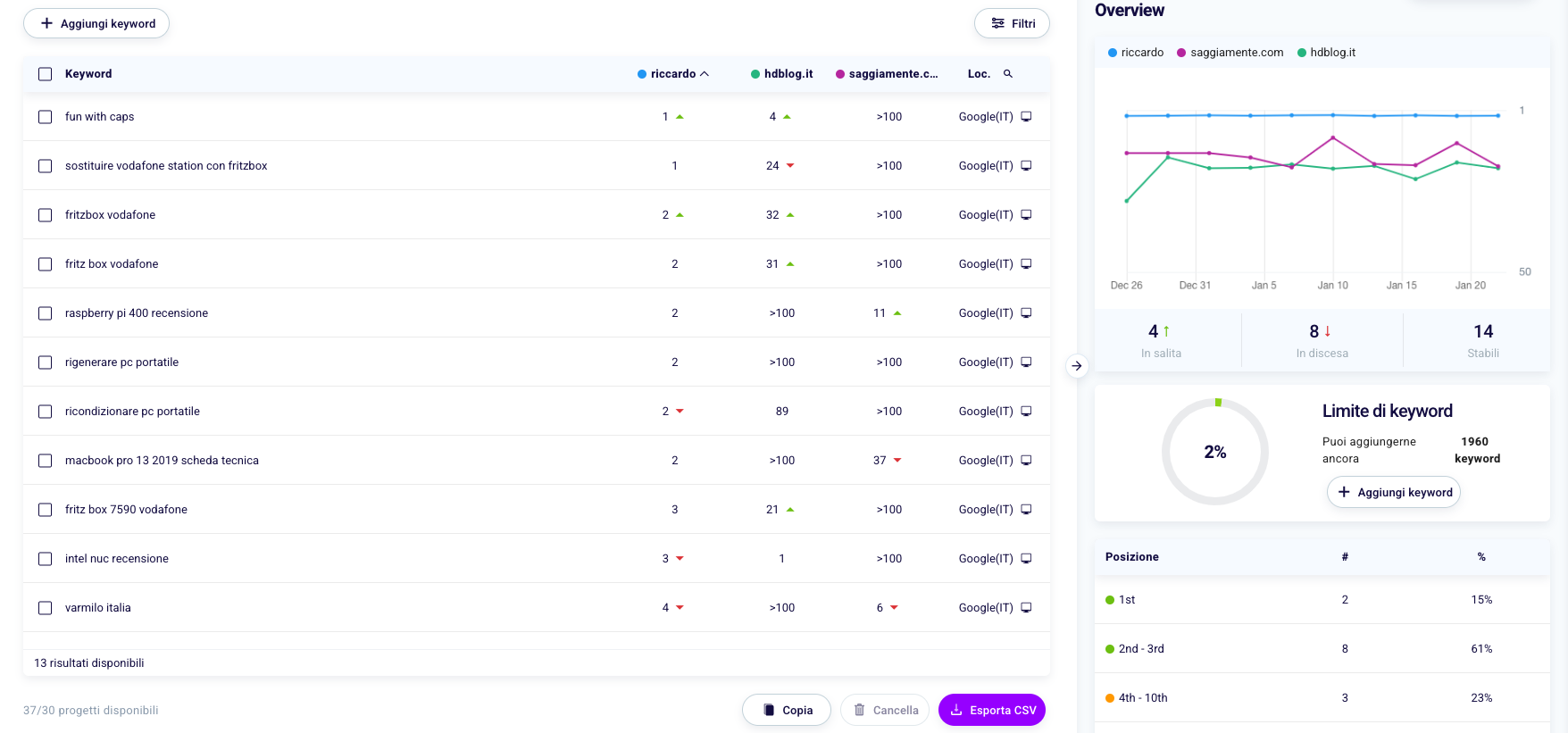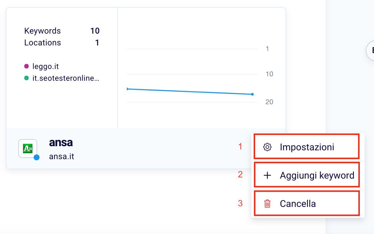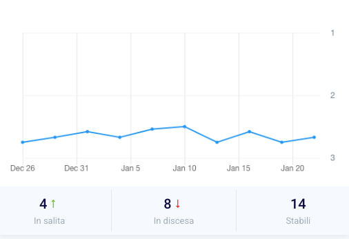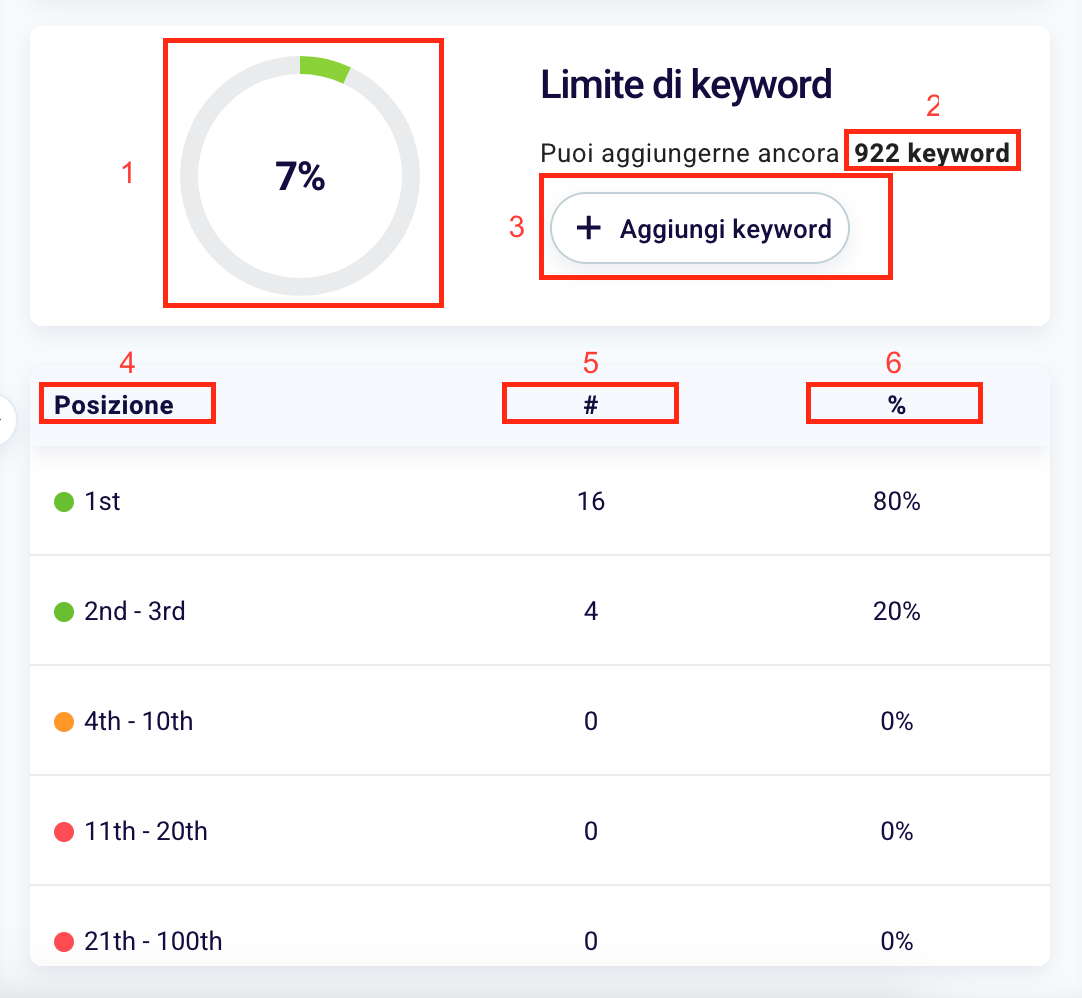 The point inside the graph (1) represents your current and past position. In box (2) you can see the number of pages that have improved their positioning and in (3) instead how many are in lower positions than those recorded at the start of tracking. In the last box (4), on the other hand, the keywords are stable, that is, those that have not changed position.