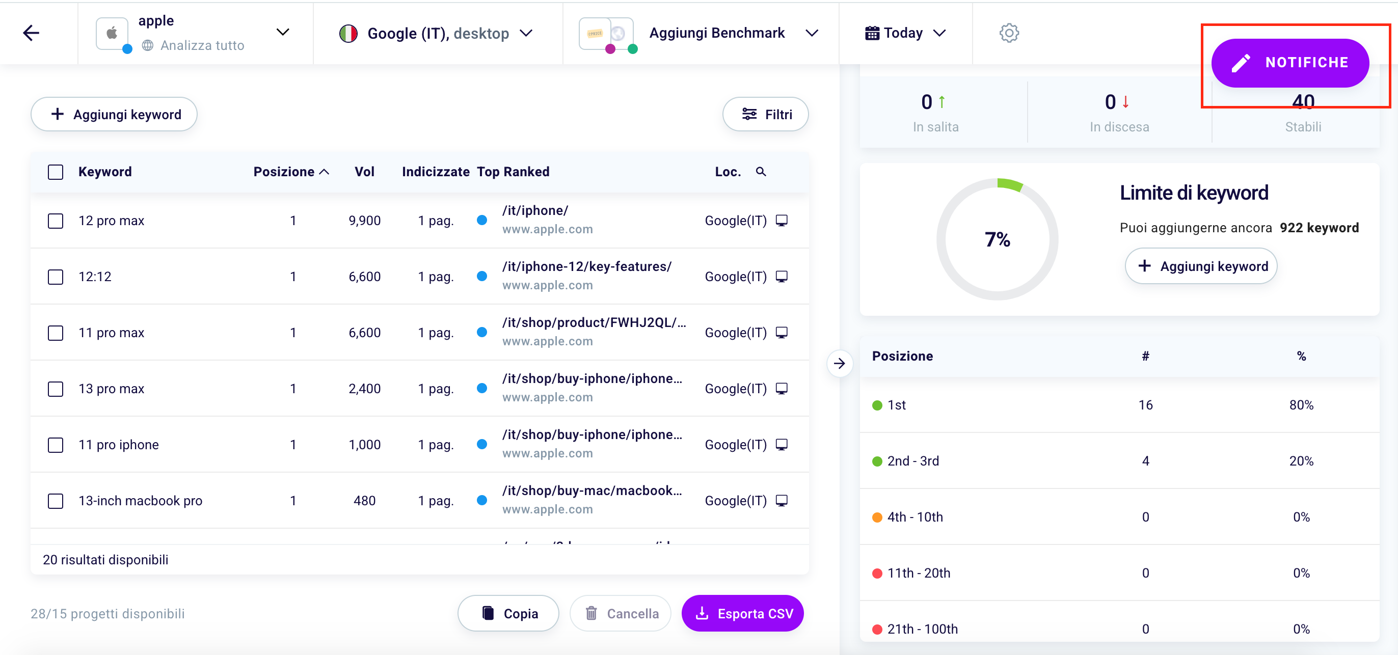 In the circular chart (1) you can see the percentage of keywords traced, 7%, compared to those that you can still trace with your plan or, in this case, “922 keywords” (2). Do you want to track others? Click “Add keyword” (3).