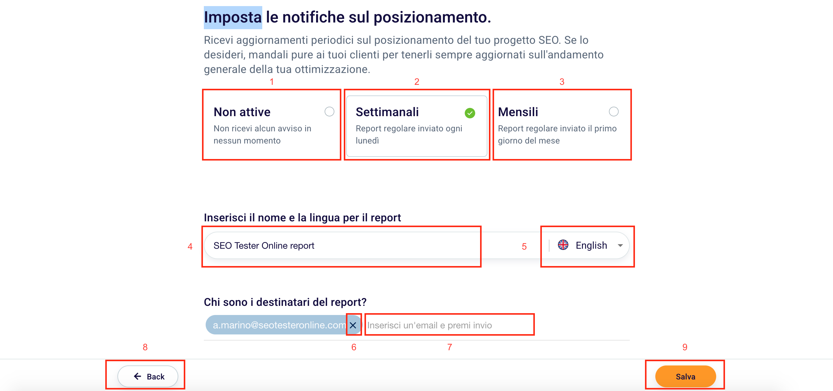 You can change the Name (4) and Language (5) of the Report by modifying it in the respective boxes and select, while you can type in the box (7) the email address of the recipient you want to receive your SEO Report and remove, if you want, the current ones by clicking “X “(6).