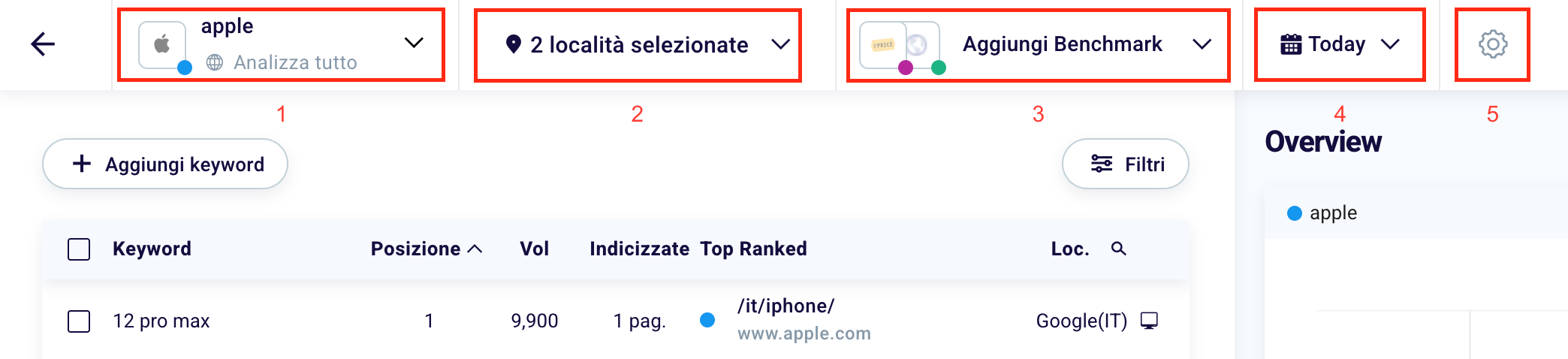 “Indexed” (3) indicates the number of web pages on your website indexed with that specific keyword. “Top Ranked” (4) is instead the page among those indexed (which unlike the case in question can be even more than one) that has obtained the best position on the search engine results.