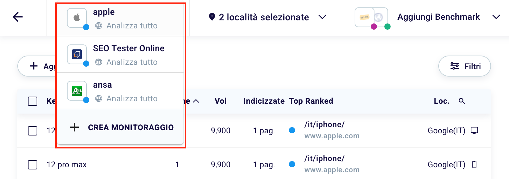 If you want to compare the SEO performance of the site you are managing with those of your competitors, just click on “Add Benchmark” (3).