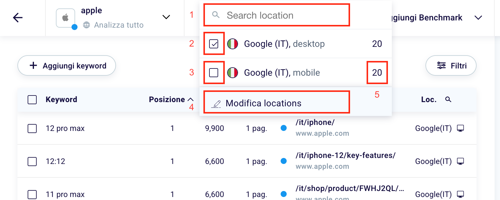 Type in “Search location” (1) words present in the locations selected during the design phase. Choose one or more locations. The box with a tick (2) identifies the configurations chosen, the box without a tick (3) instead identifies the configurations that you have chosen not to show in the table. If you want to set new countries or devices, or remove the chosen ones, just click “Change locations” (4). “20” are, in this case, the number of words monitored for this specific configuration.