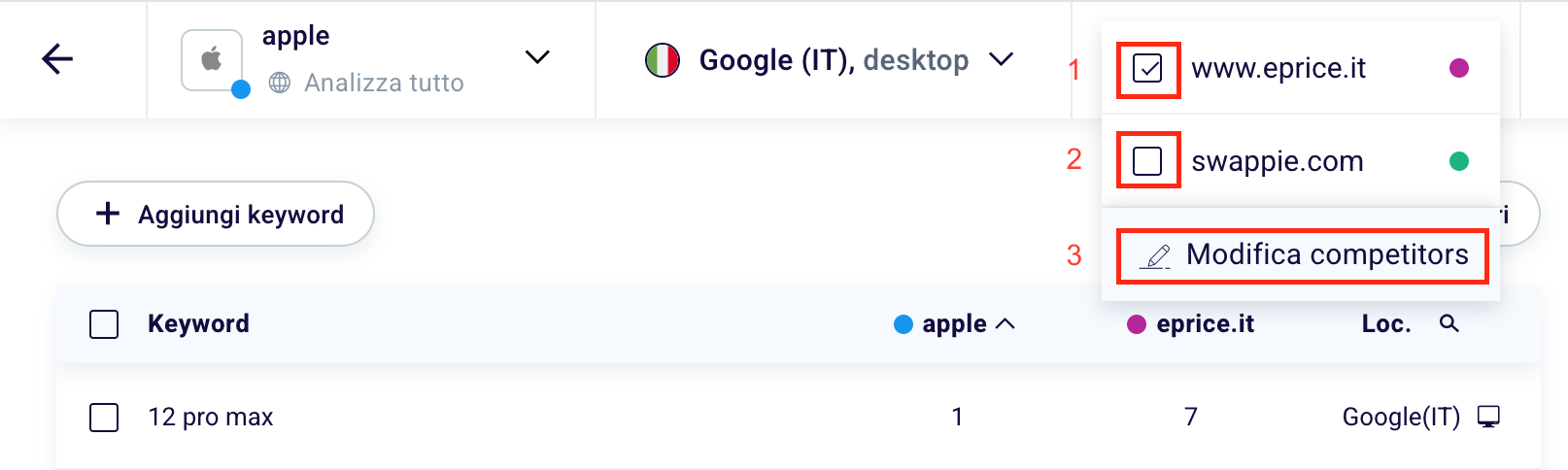 Here you can select (1) or deselect (2) your competitors, add new ones or remove existing ones (3).