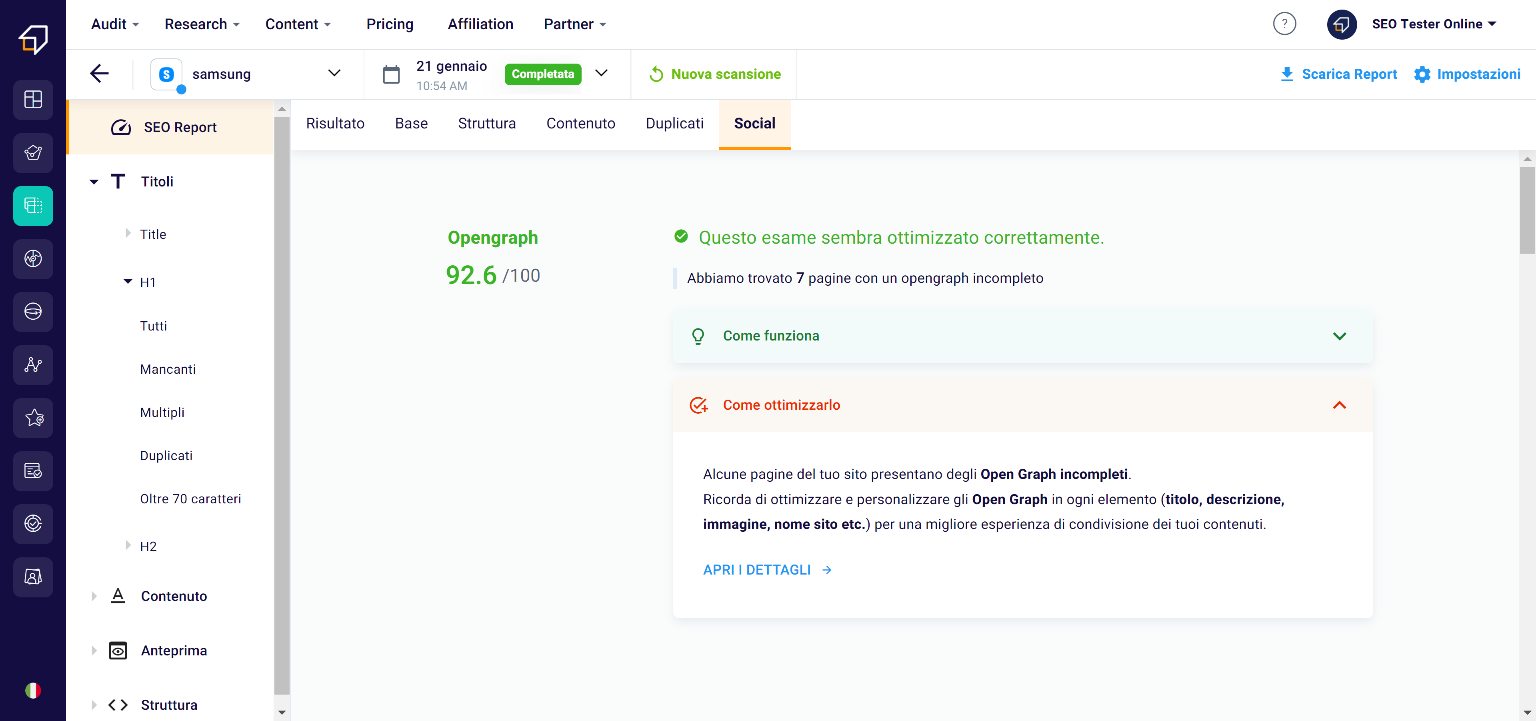 Thanks to the Social section you will be able to see the pages of your website for which the snippets and social cards have not been correctly set.