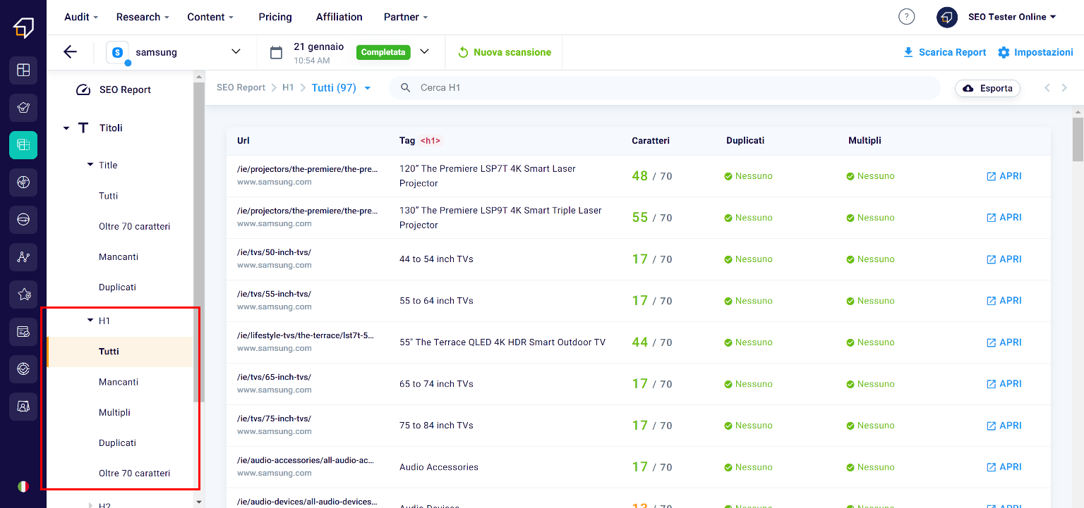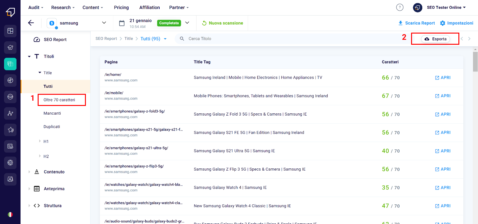In this section you will have the possibility to filter them, for example in order to identify those that exceed the maximum size of 70 characters (1) (beyond which a title is cut) and export them to .xlsx files (2)