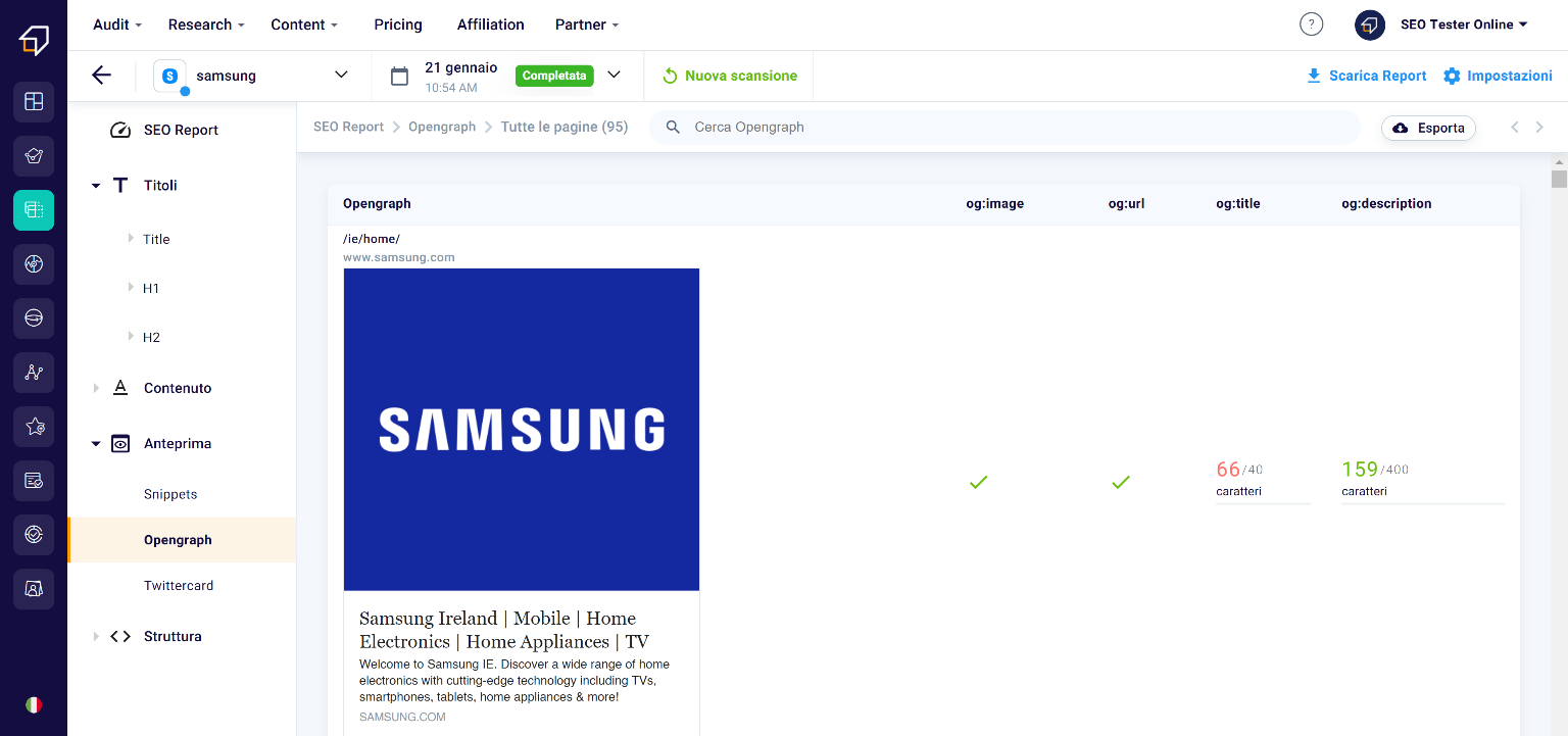 Under the macro-category “Preview” we find the sections “Snippets”, “Opengraph” and “Twitter Card”.
