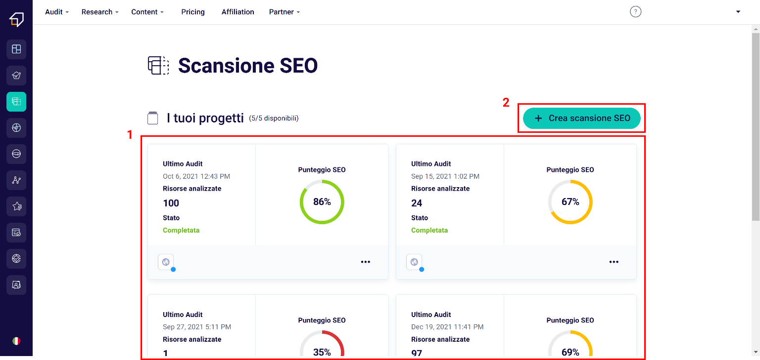 Within the page that appears, in fact, you can decide whether to use one of your existing SEO projects (1), or create a new scan (new SEO project) (2).