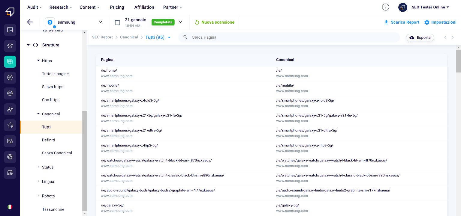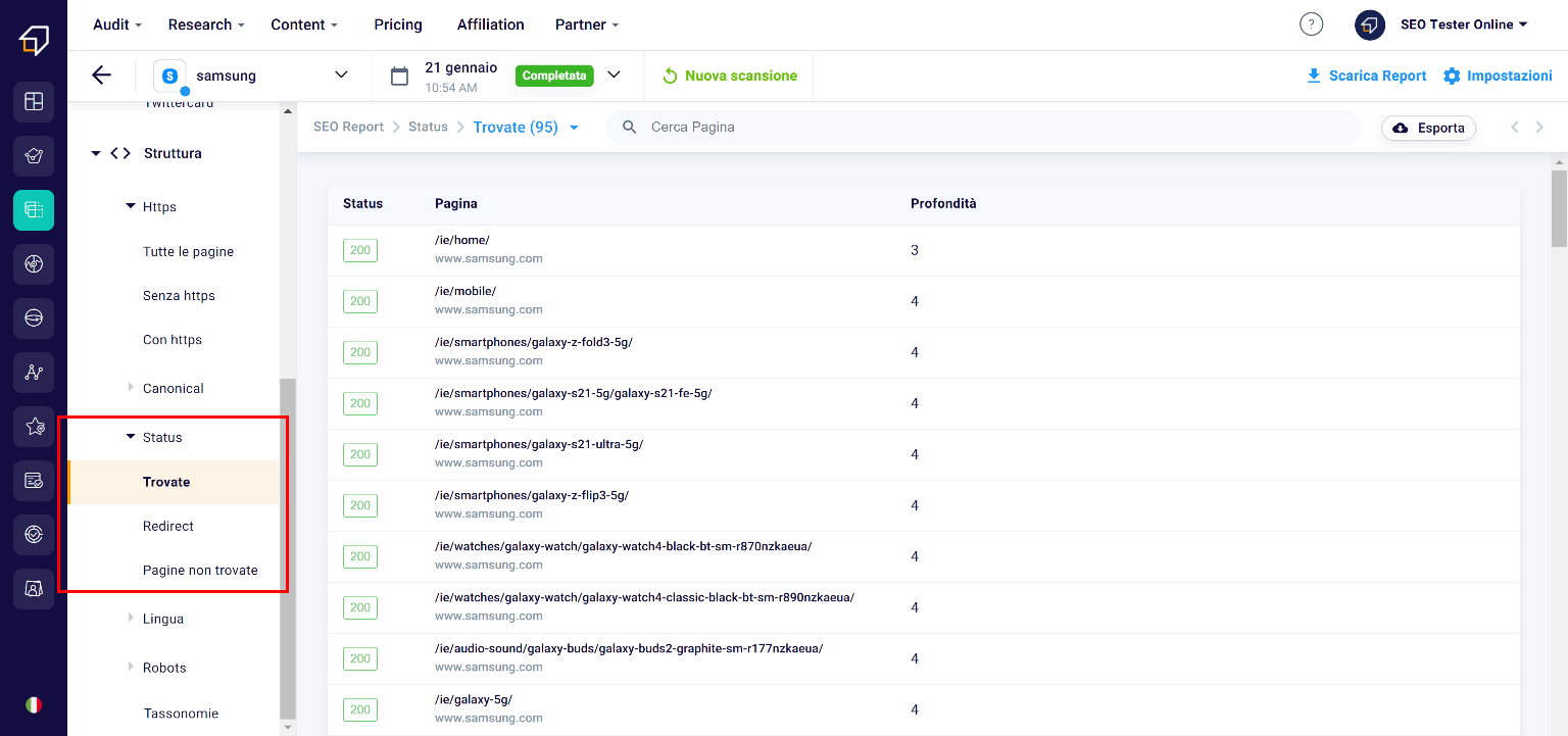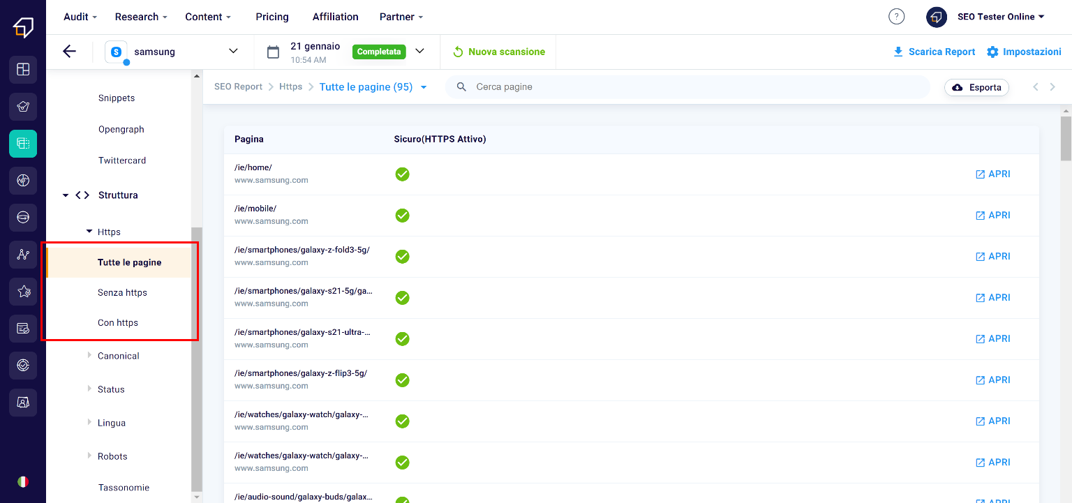 In this section, you can filter pages according to two criteria – pages with https and without – and export the list. In this way, you can also avoid the presence of so-called “mixed contents” on your site, ie pages and resources with different protocols within the same site, a practice not well received by search engines.