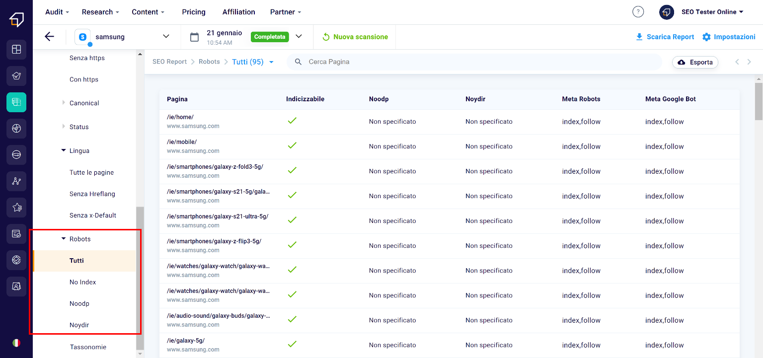 Here you will have the opportunity to view which pages in the robots.txt file have the noindex attribute – which invites you to block the indexing of that page to search engines – noodp and noydir, which instead suggest to search engine robots not use the site information found in the Yahoo and Open Directory Project directories.
