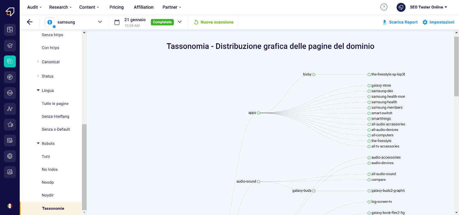 Finally, the Taxonomies provide us with a graphical representation of the distribution of the pages and the link between them within the domain.