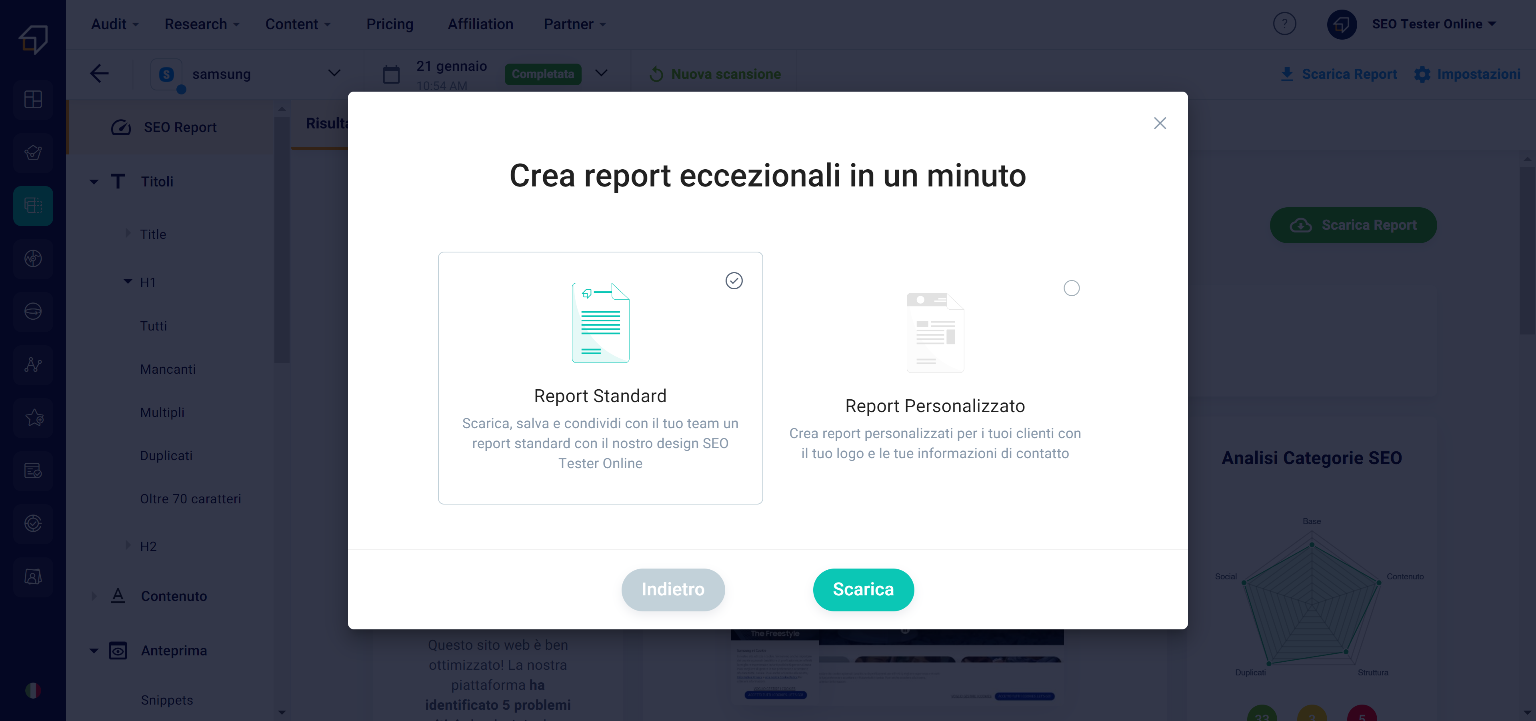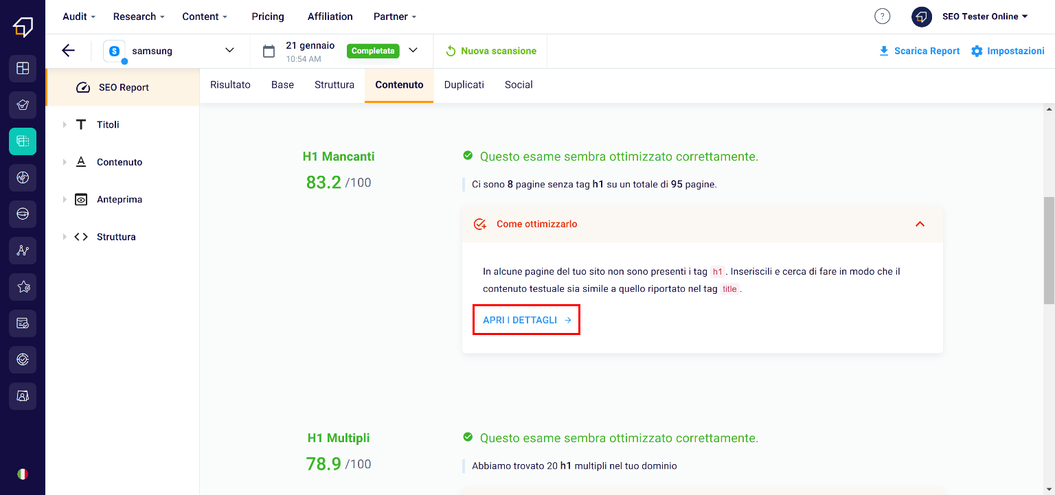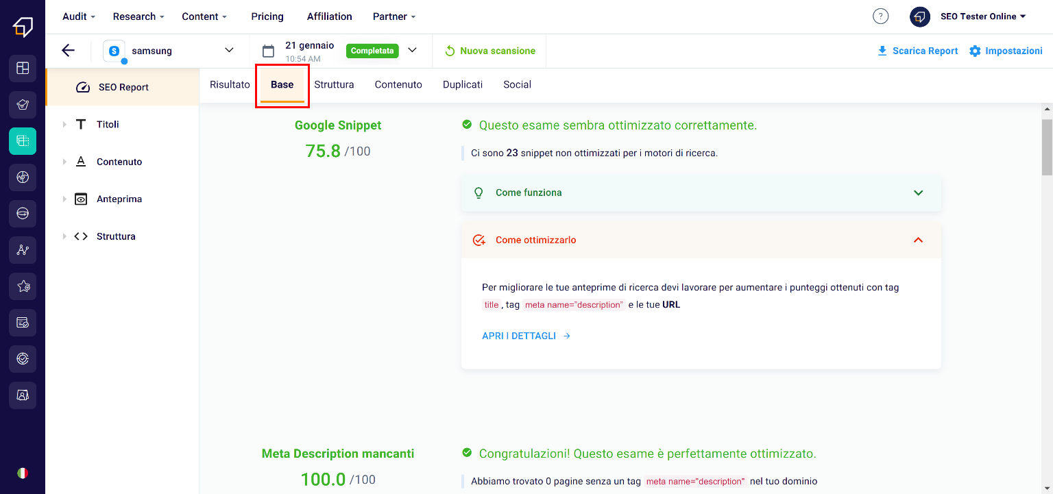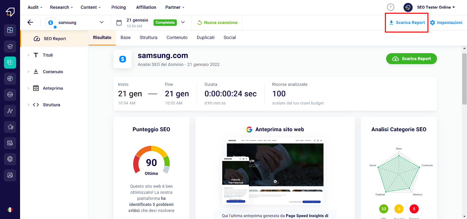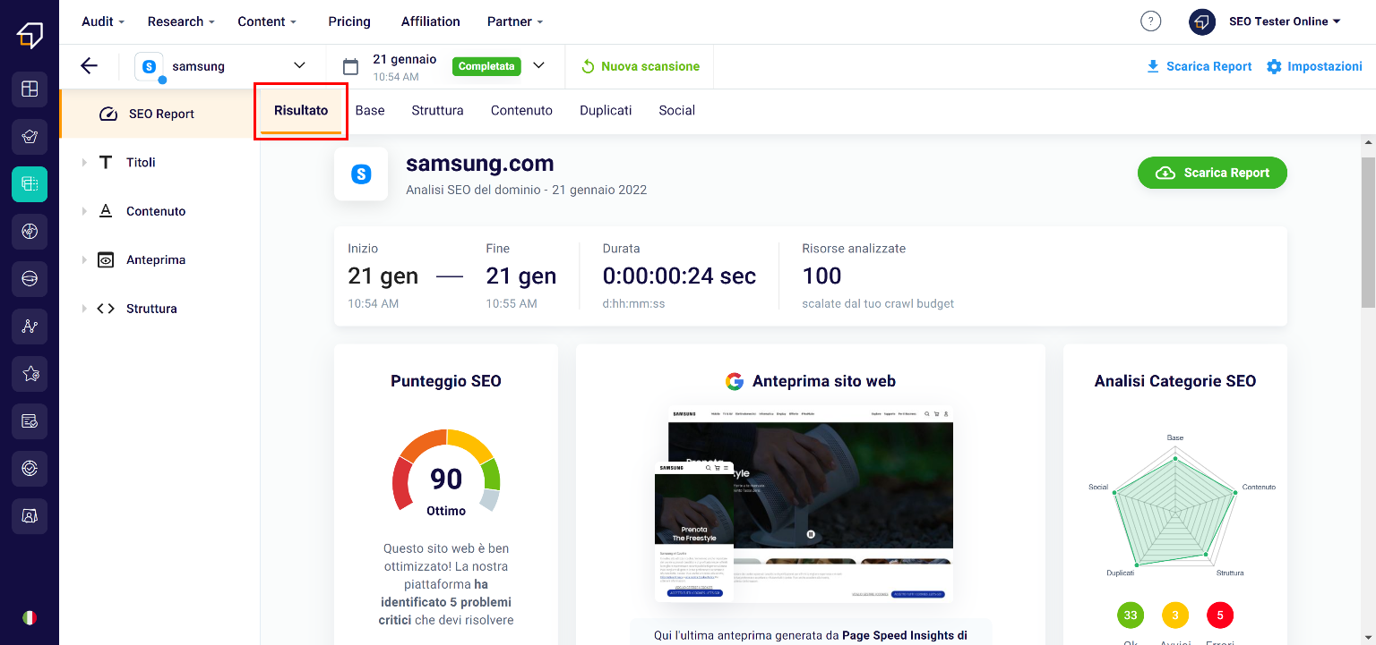 • the upper one (2) thanks to which you can study the 5 SEO Categories: Basic, Structure, Content, Duplicates and Social.
