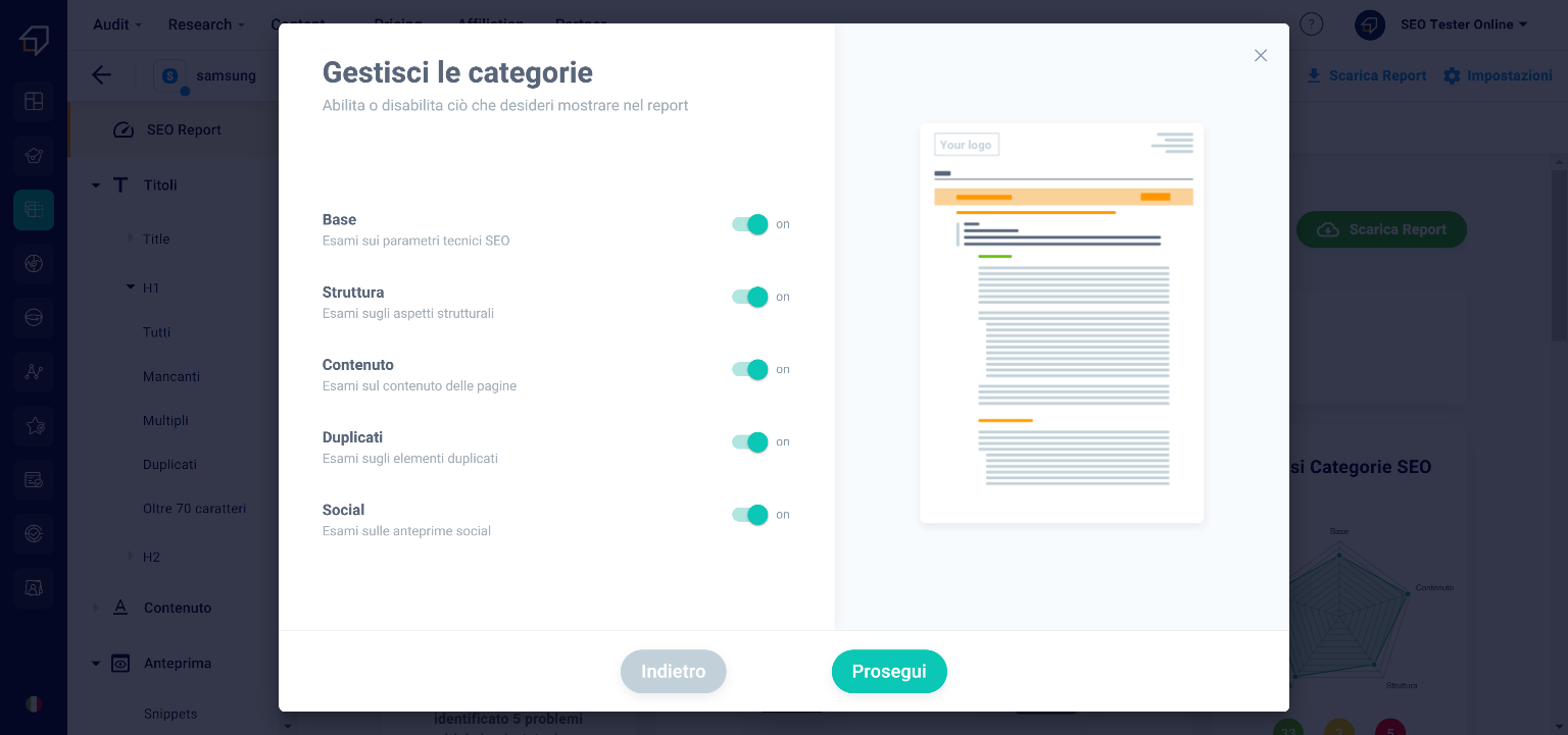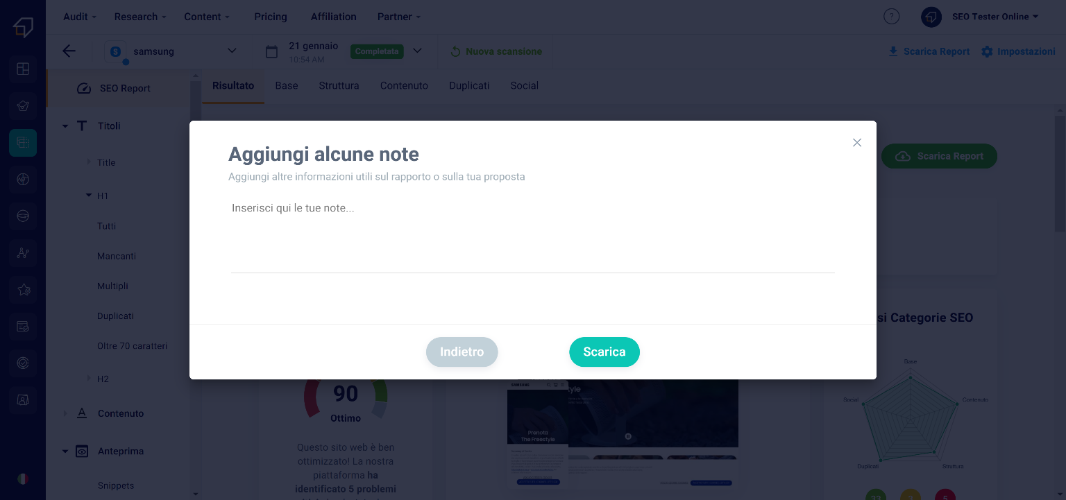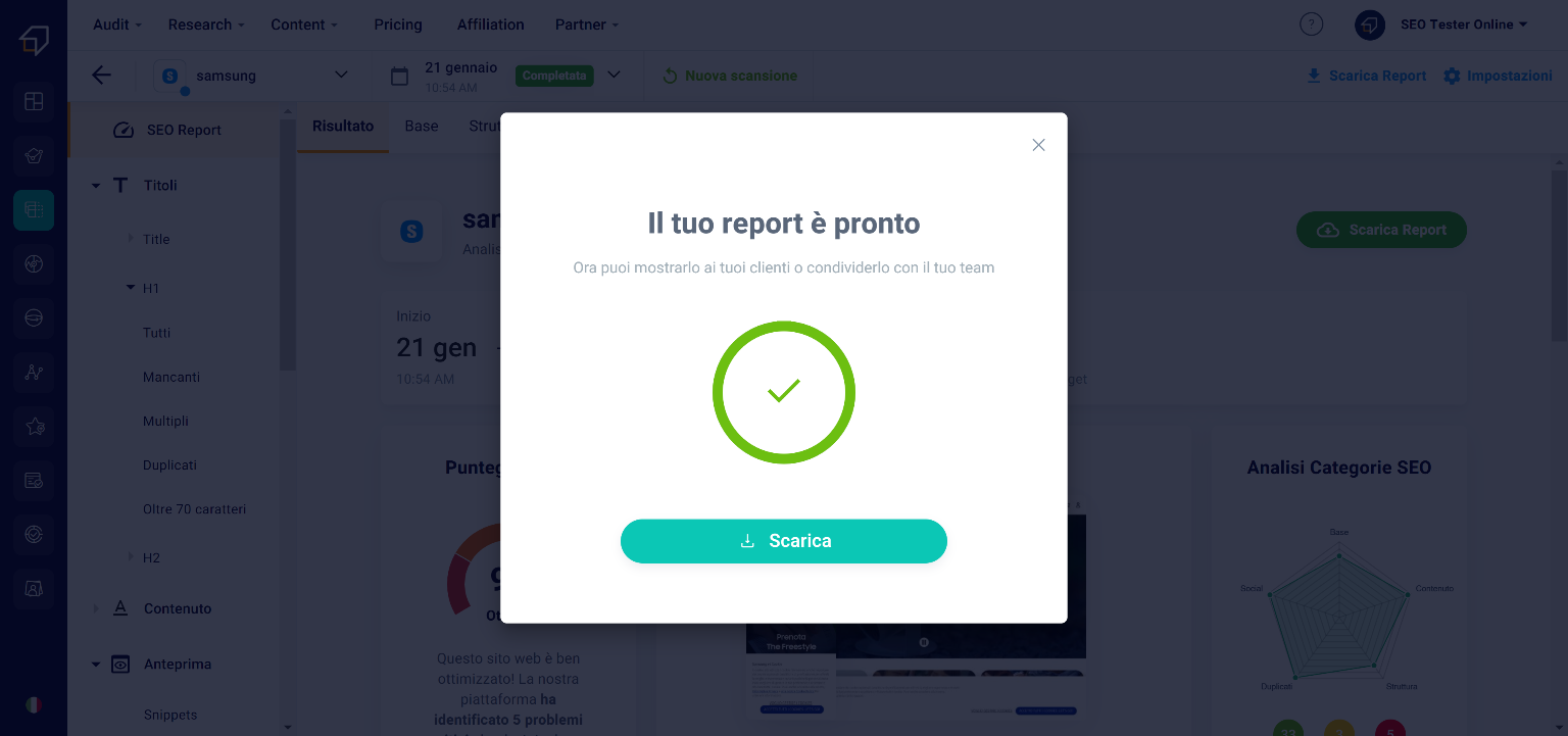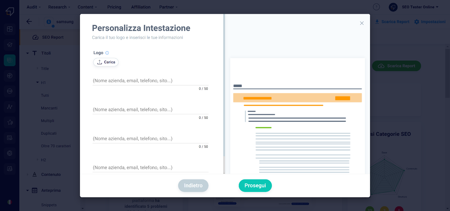 What will be downloaded will be a .pdf document in which you will find all the information of the various sections of the tool, including the aspects to improve and advice on how to do it. This report features the SEO Tester Online logo and contact information