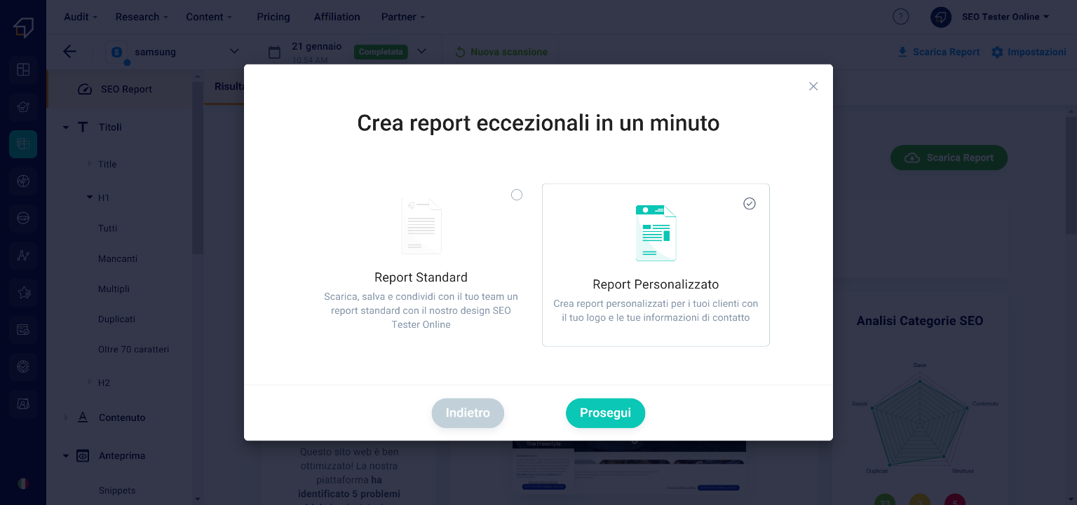 By clicking on this button, you can choose to create a standard report or a “White label report”, that is, customized with your logo and company information.