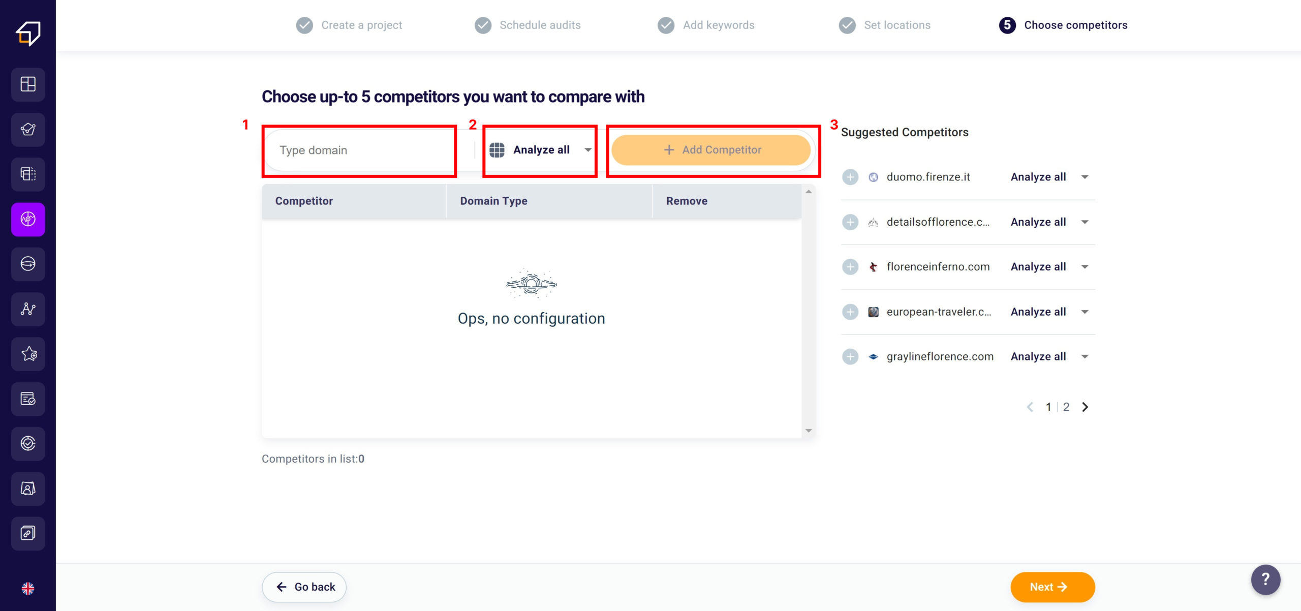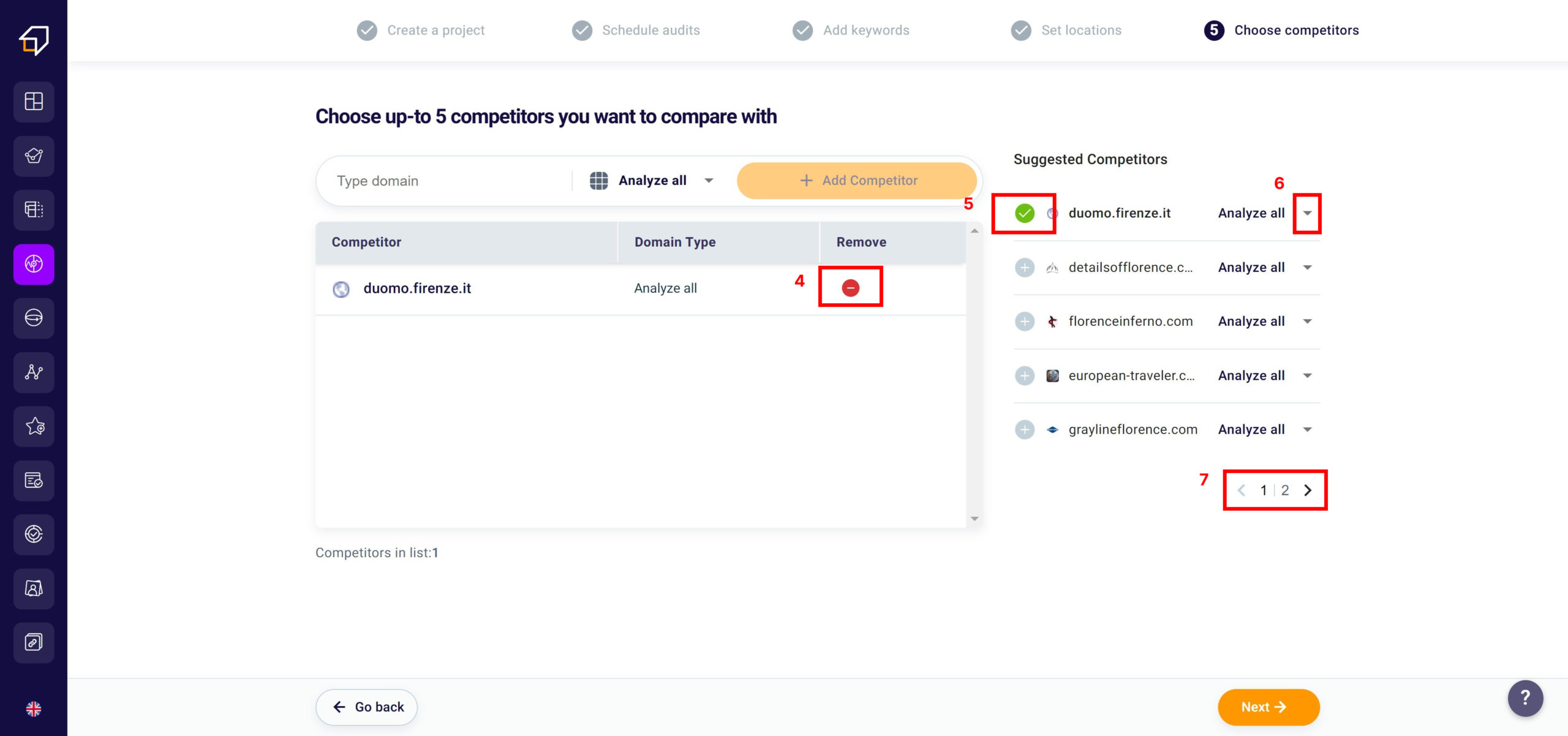 On the right section, our software automatically recommends some competitors to introduce to your list. To add them you will need to click the “+” button (5) to the left of the URL. Also in this case you can decide what to analyze by clicking “Analyze all” (6).