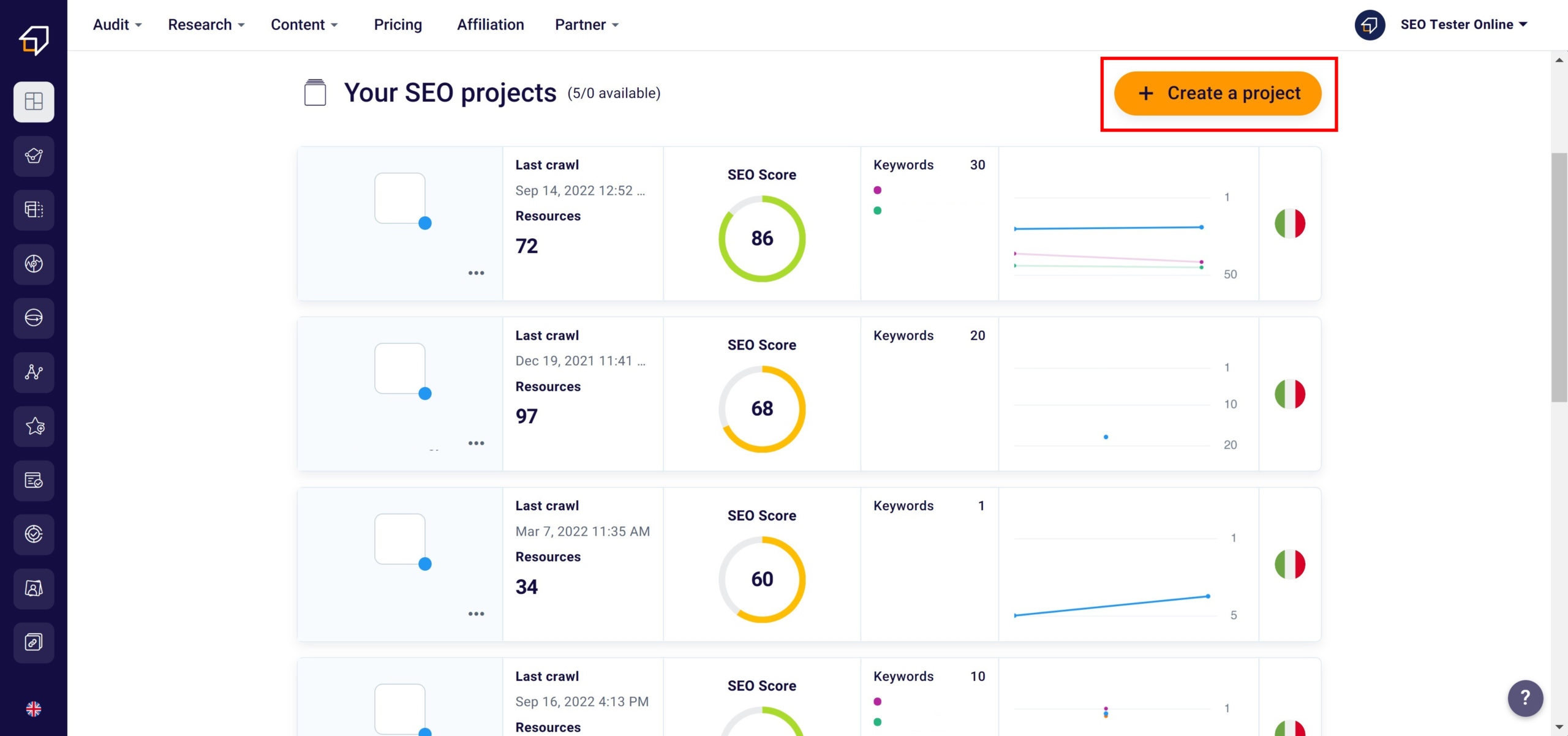 To make it happen, just click on the orange button “+ Create SEO project” in the dashboard accessible from here.