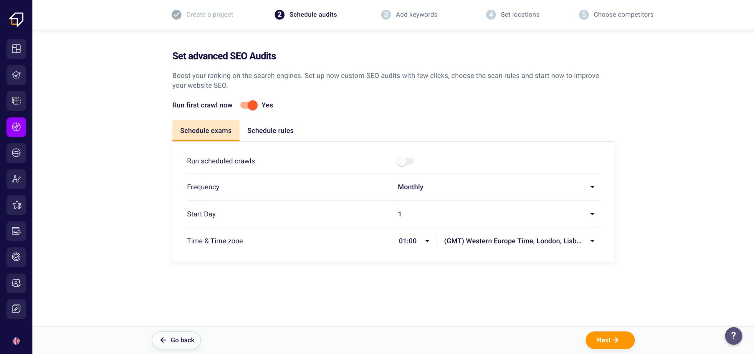 After clicking on “Continue”, you can decide how to perform the SEO scan of your site. By clicking on the switch (toggle) in orange you can determine whether to start the SEO analysis immediately or not. By default the scan will be active and then it will start immediately. In case you decide not to activate it immediately, you can also activate the scan at a later time.