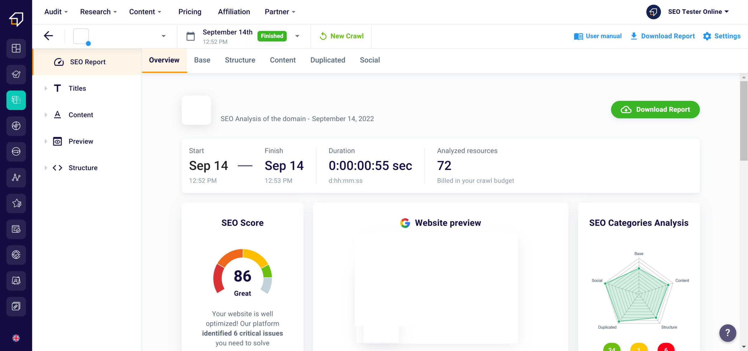 By clicking “Find out the score” under the word “Scan finished” you will land on the dashboard of our SEO Spider.