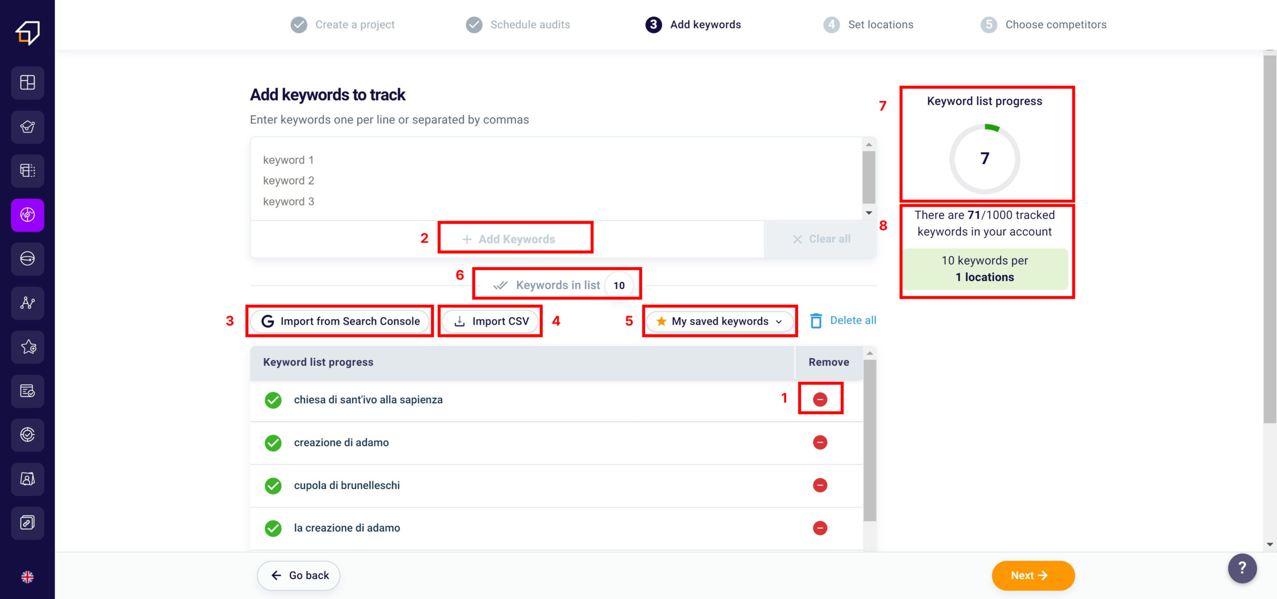 Thanks to our algorithms, our tool will automatically show you some keyword suggestions to monitor. If you do not want to track the results of a specific keyword, all you have to do is click the “X” (1) to the right of the word you do not want to include in the list to be monitored.