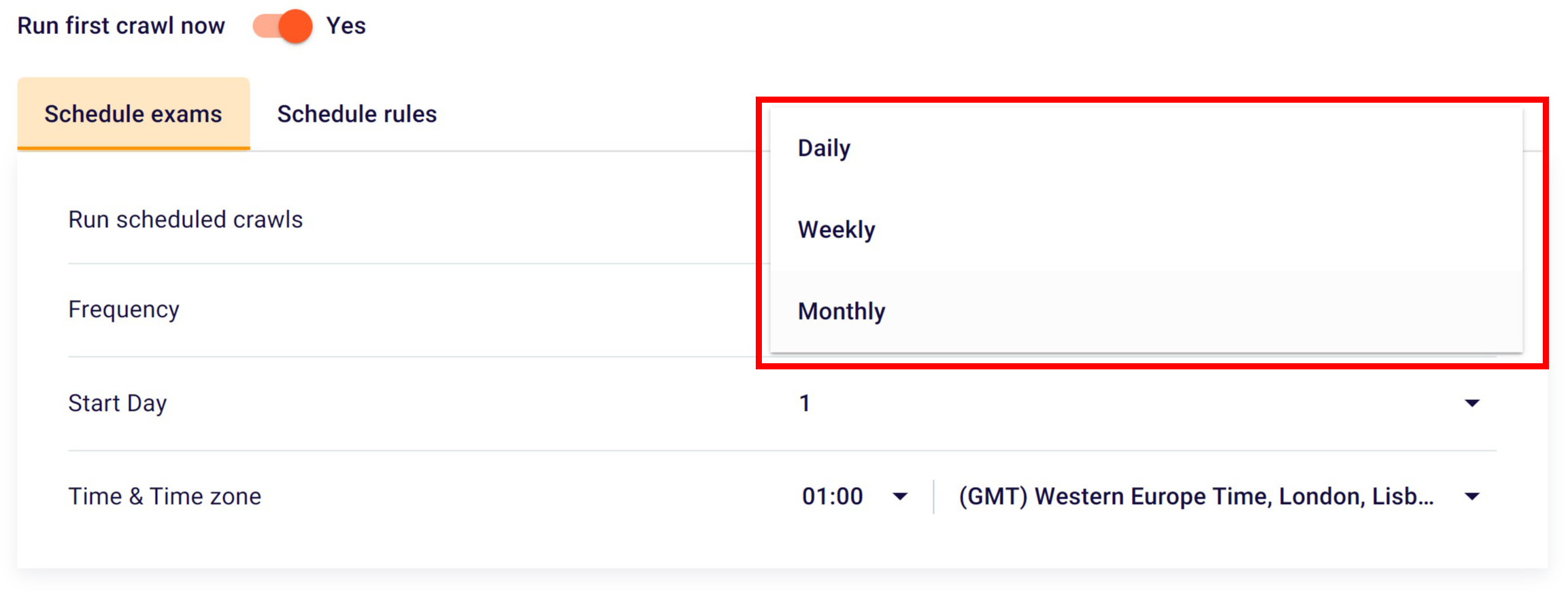 Then you will have the opportunity to schedule the exams, deciding whether or not to start the spiders on a regular basis, also selecting the frequency (monthly, weekly or daily), the starting day and the time zone in which to start the analysis.